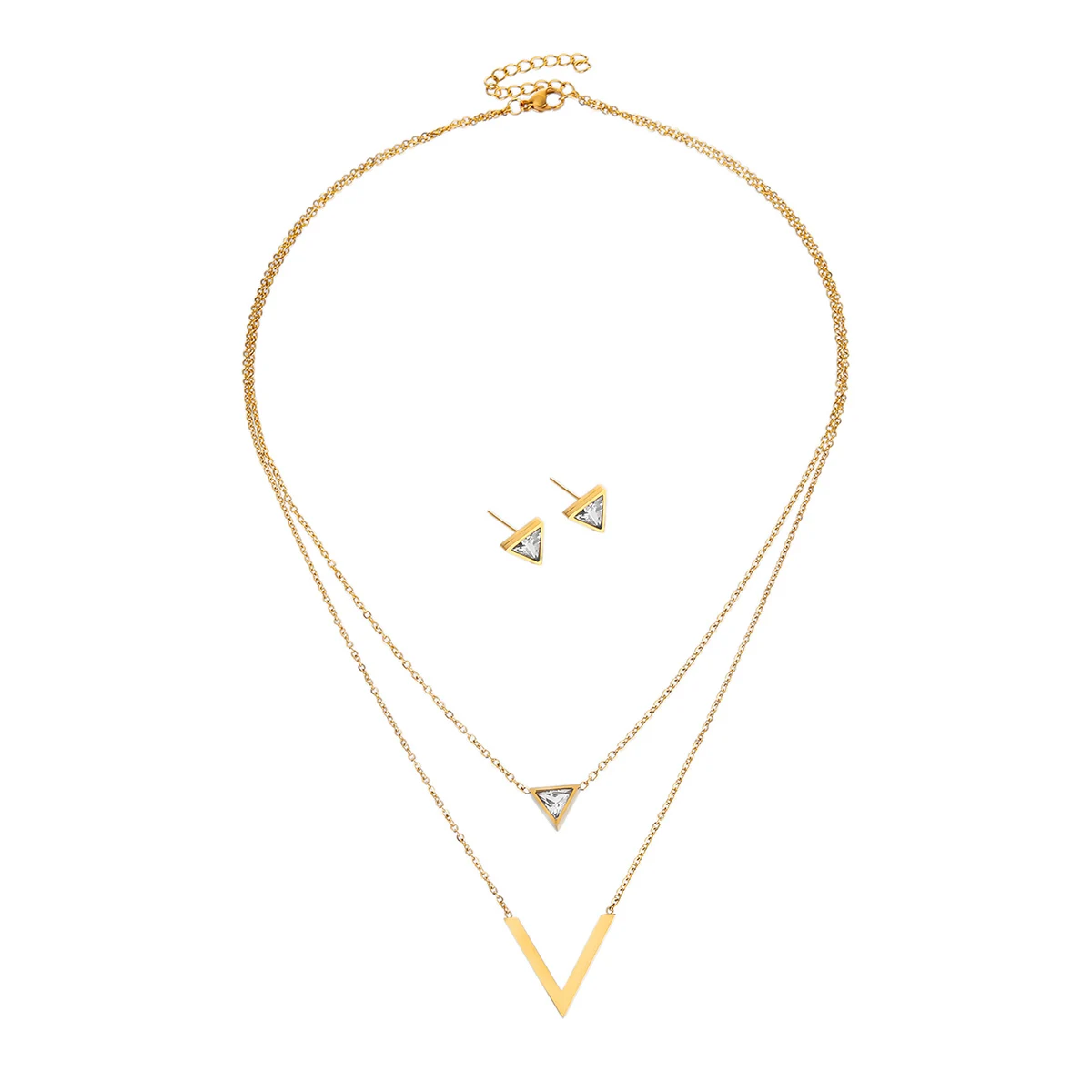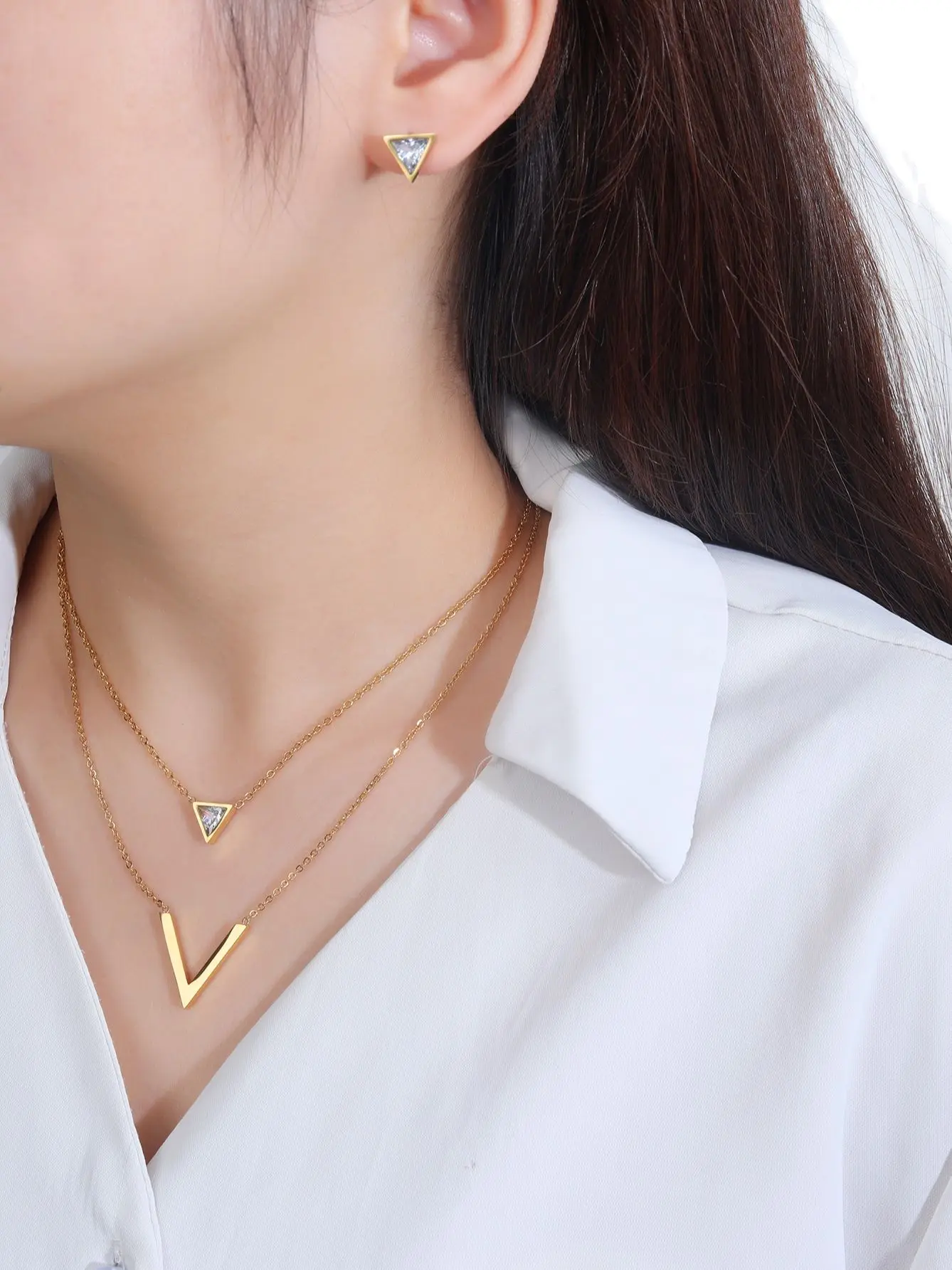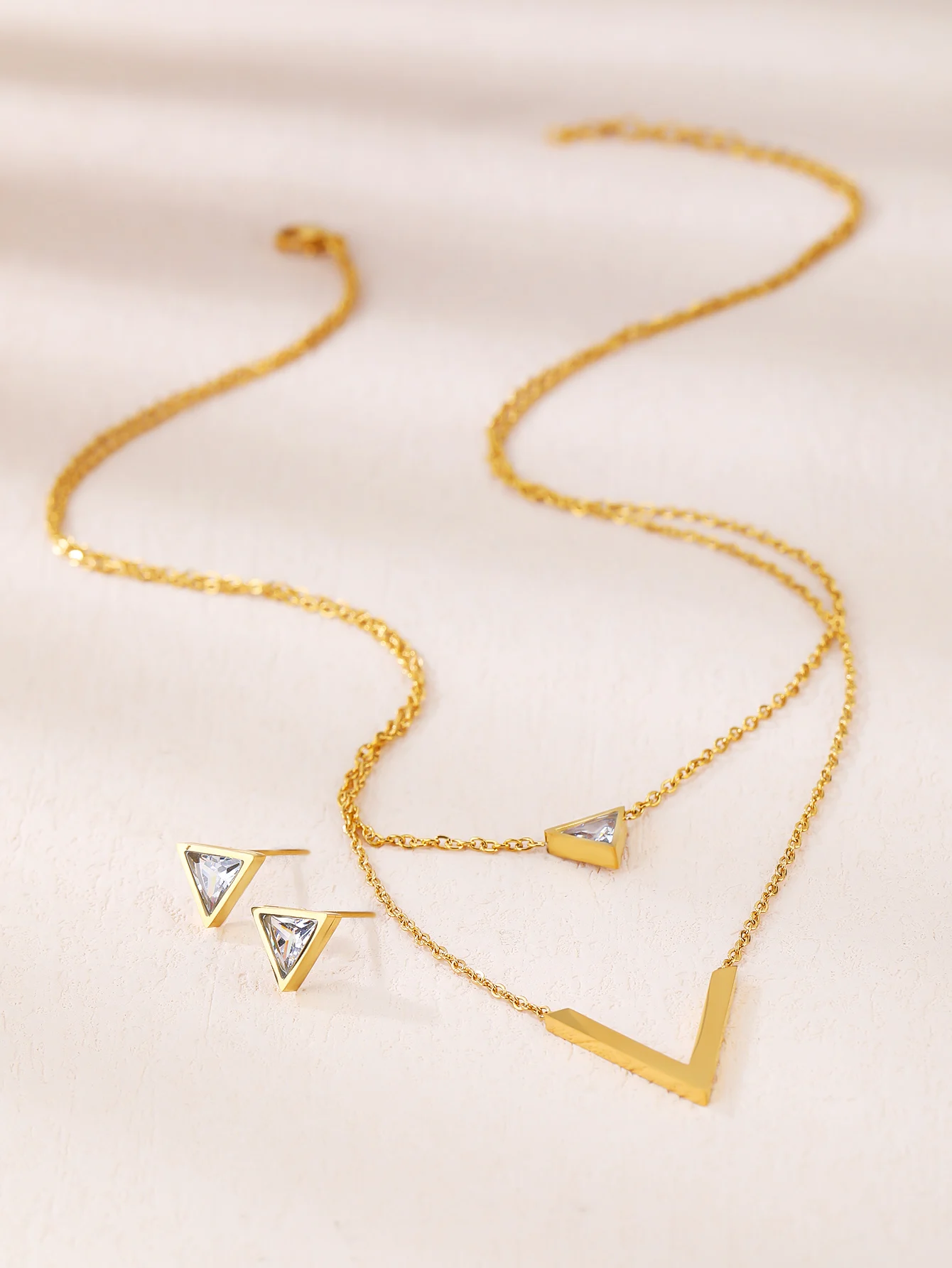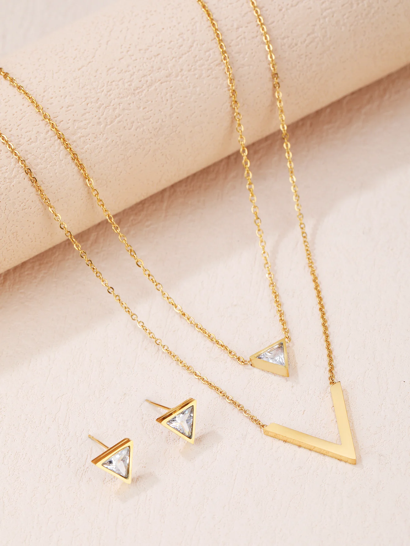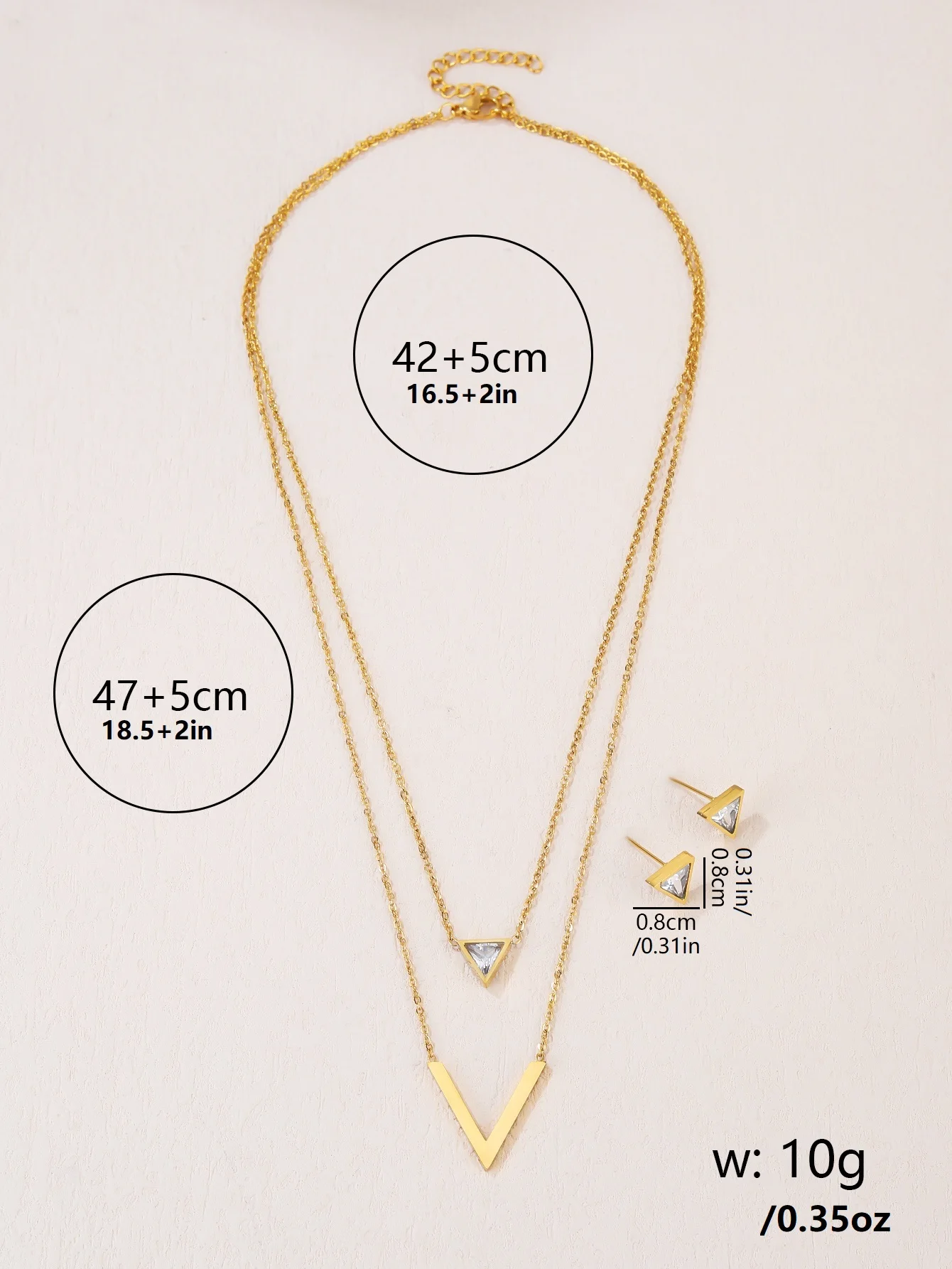 3 Piece Set Fashion Chic Ladies Triangle Zircon V-shaped Stainless Steel Double Necklace Classic Earrings Lovers Date Party Chri