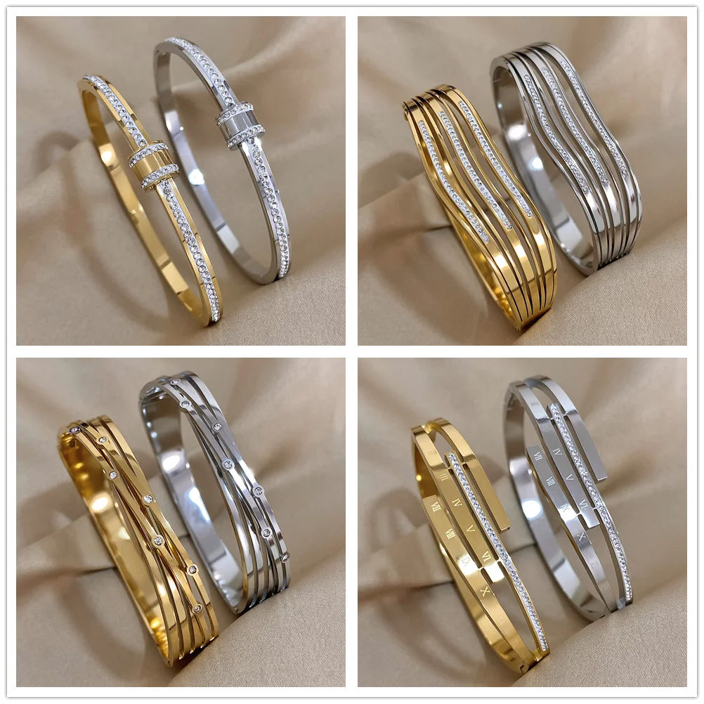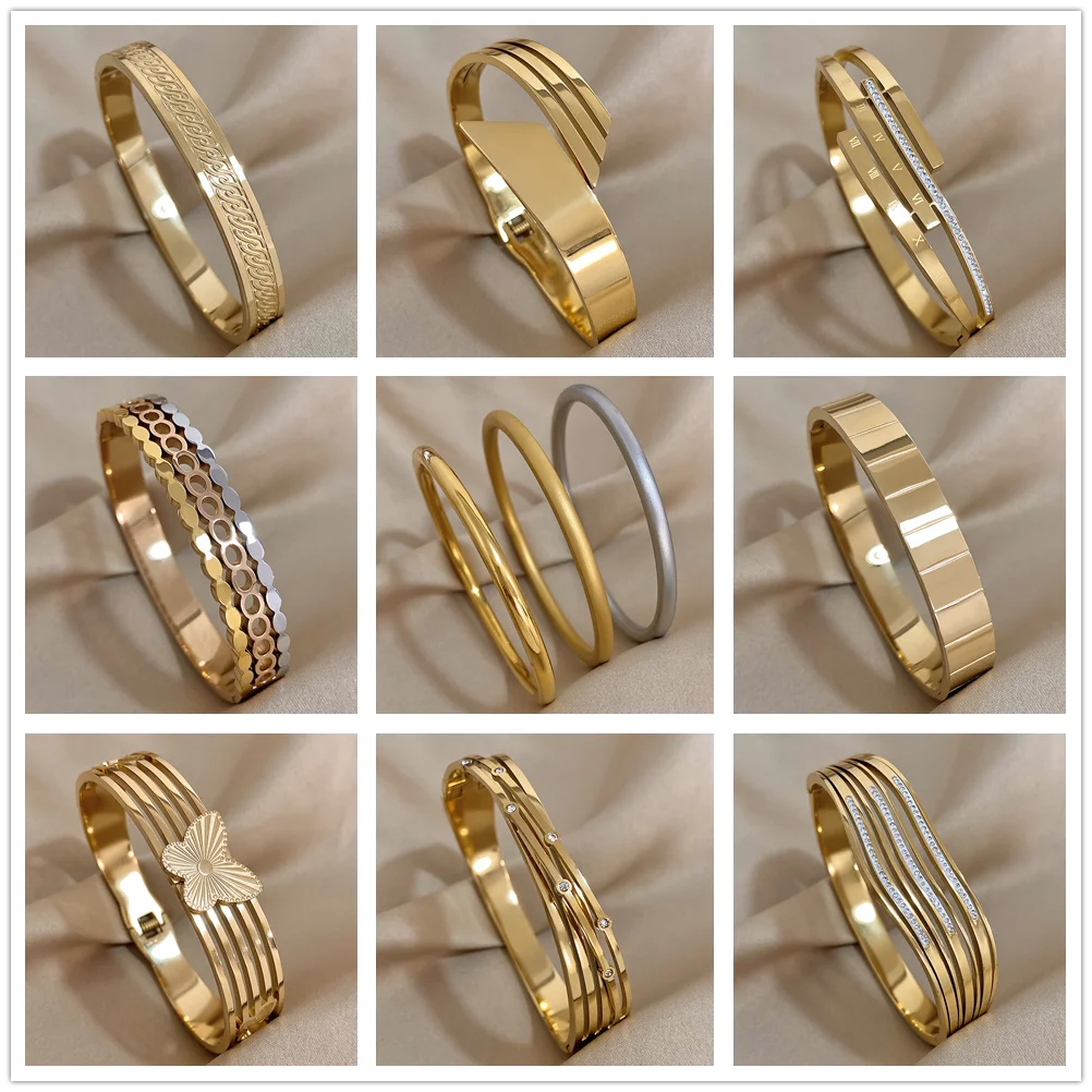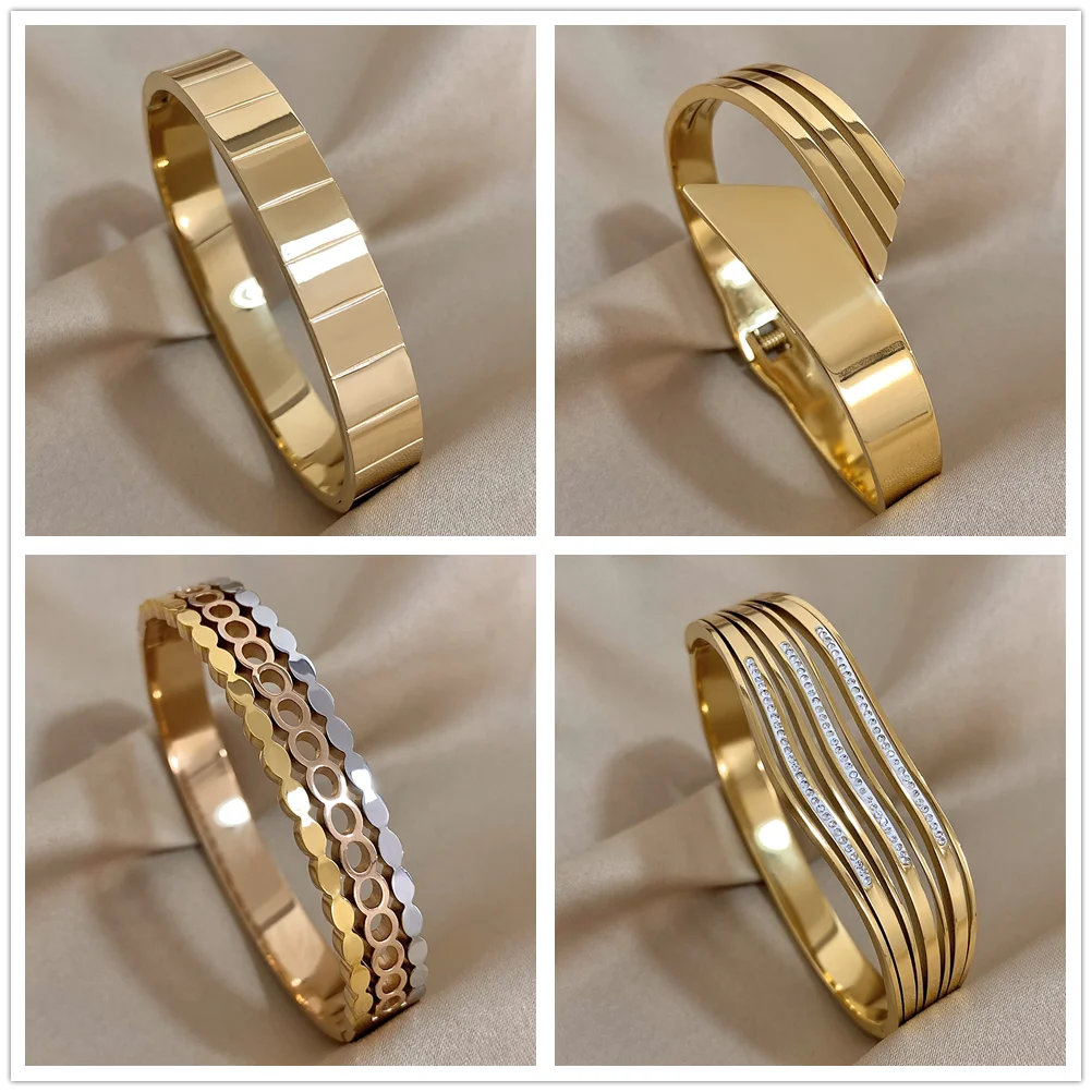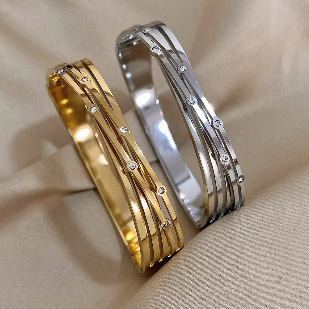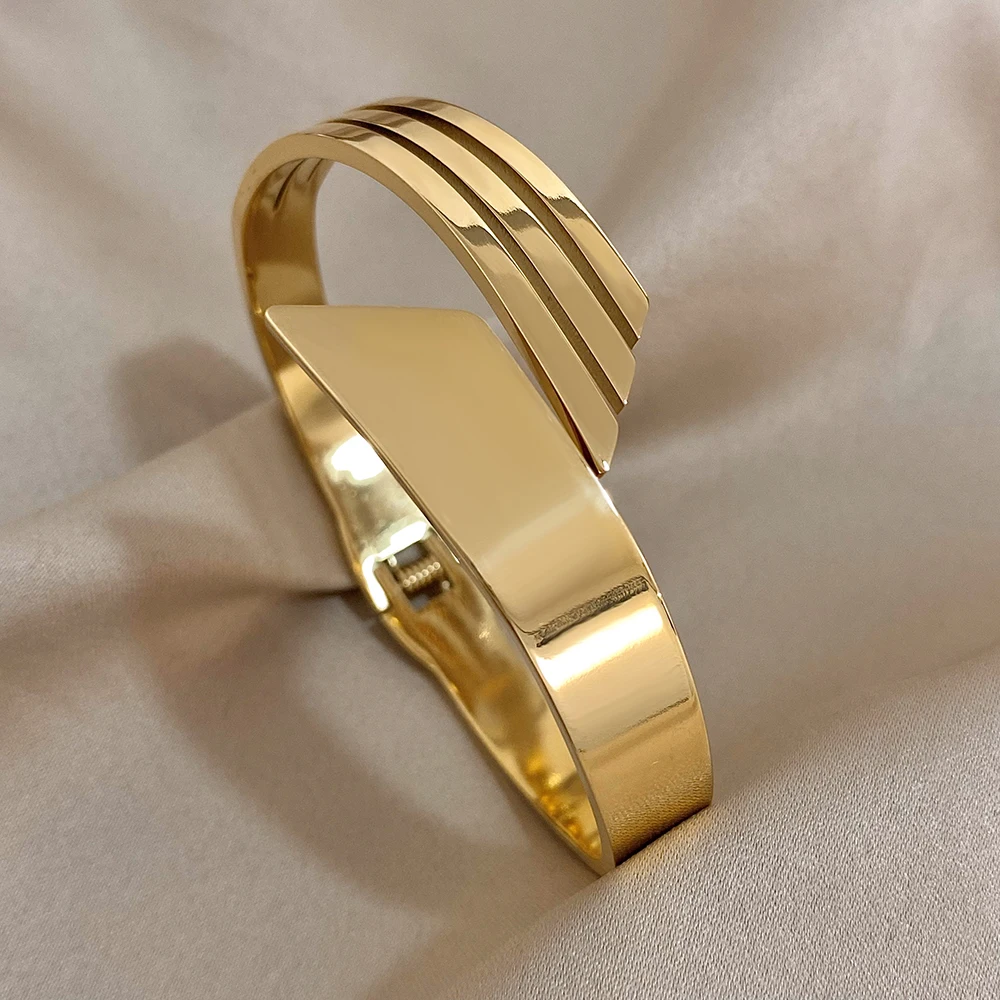 AENSOA 316L Stainless Steel Charm Geometric Multilple Simple Fashion Bangle Bracelets 18K Gold Plate Eyes Intersect Jewelry Gift