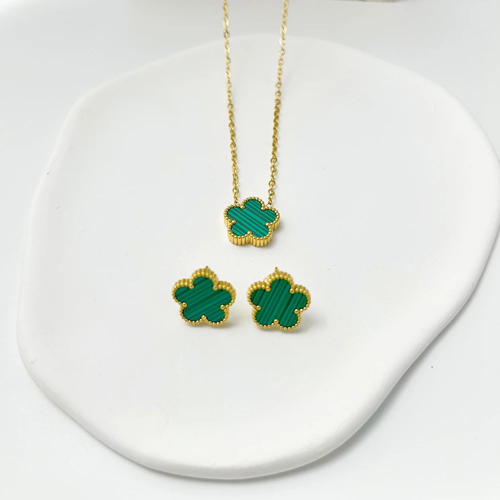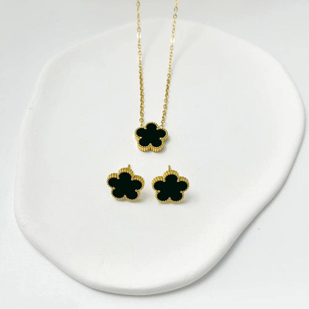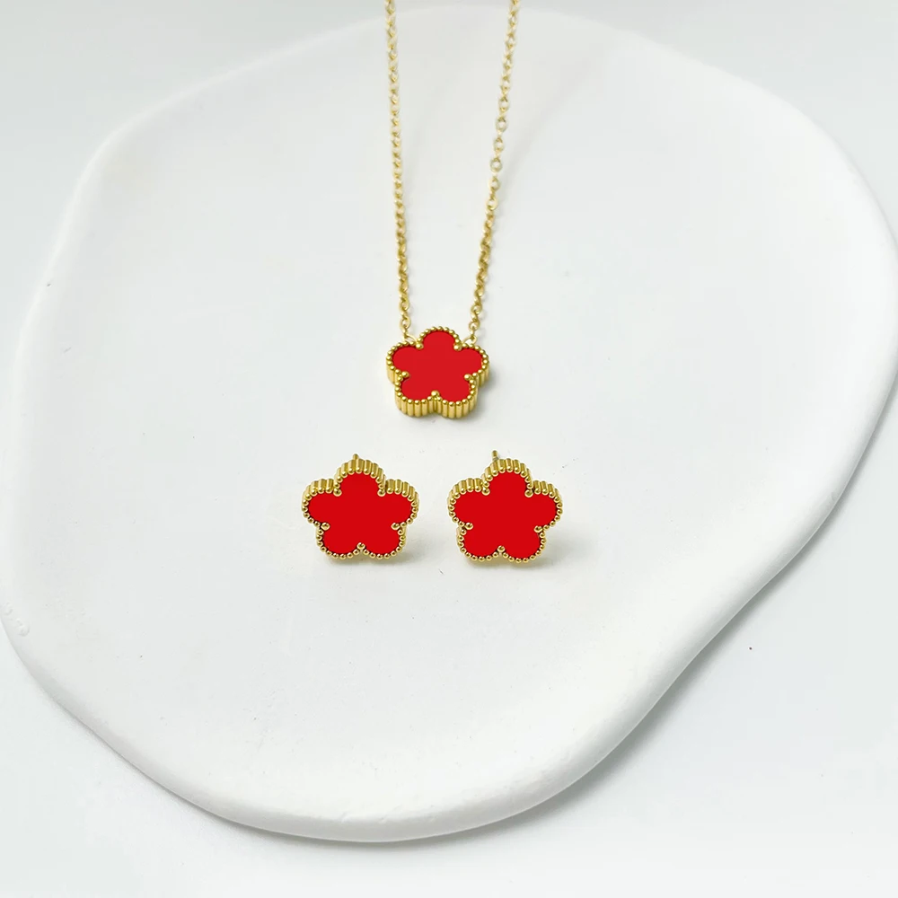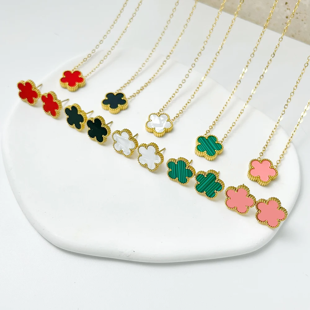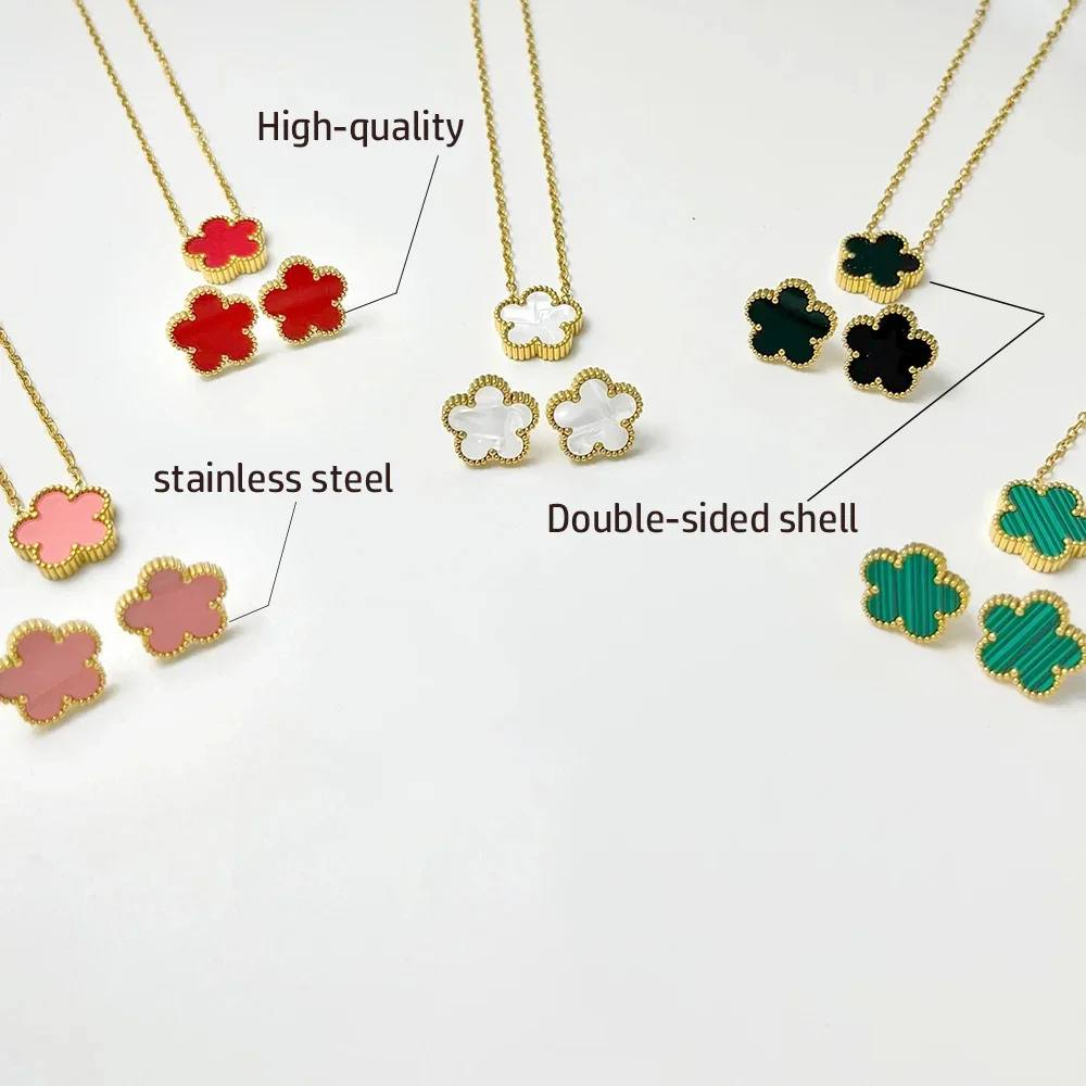 ALTERA 2Pcs Luxury 5 Leaf Flower Pendant Necklace Earrings for Women Gift Fashion Stainless Steel Double Side Clover Jewelry Set