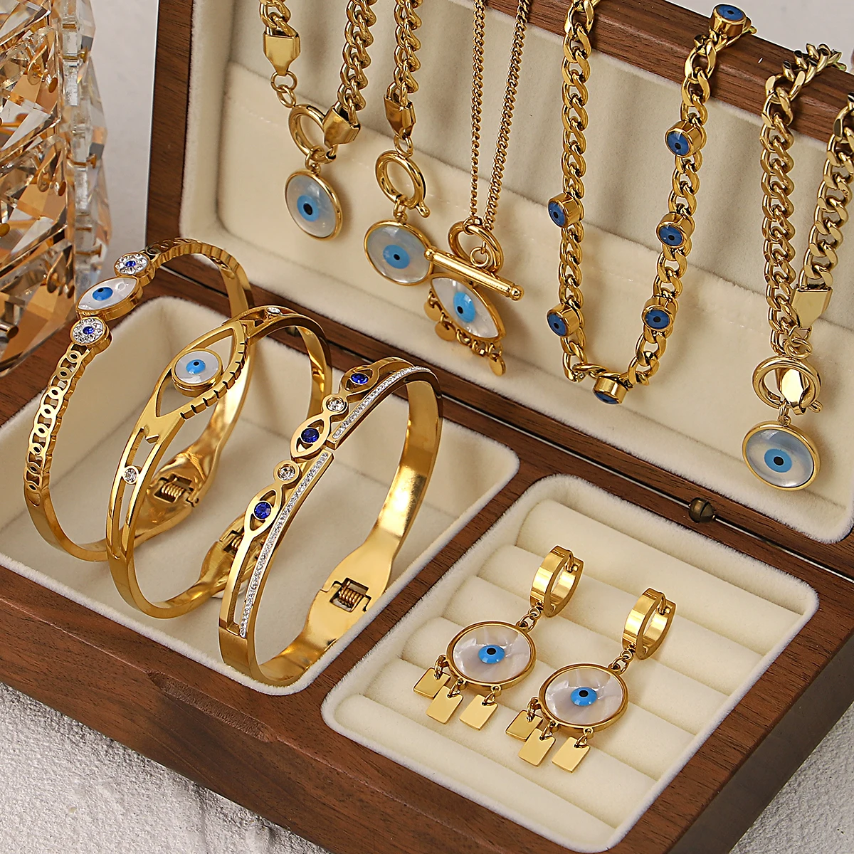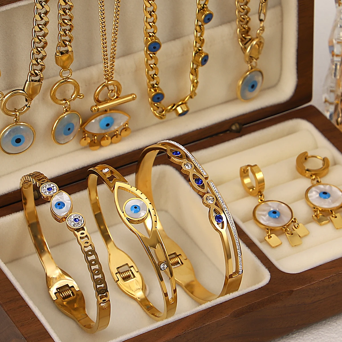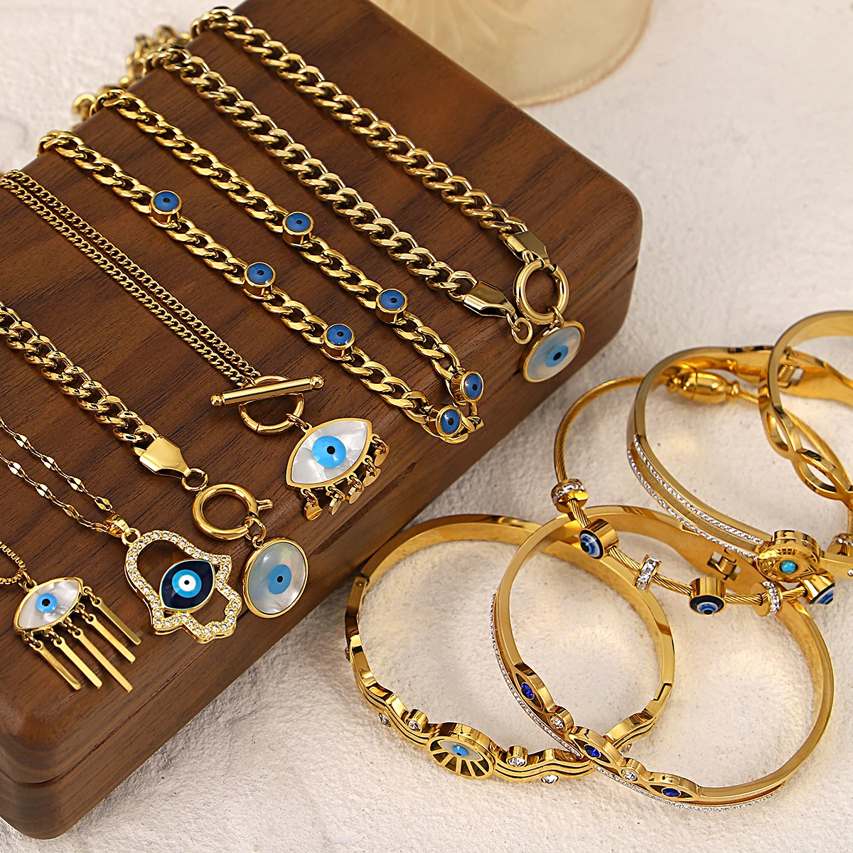 Greatera Turkish Evil Eye Stainless Steel Bangles Bracelets for Women Ethnic 18K Gold Plated Metal Charm Bracelet Jewelry