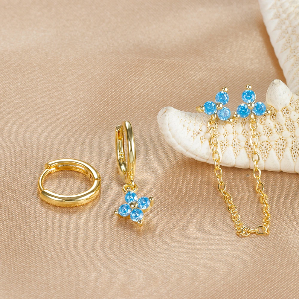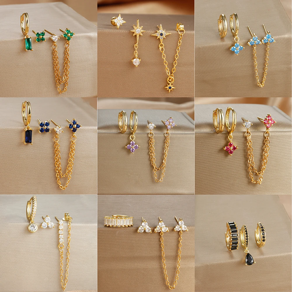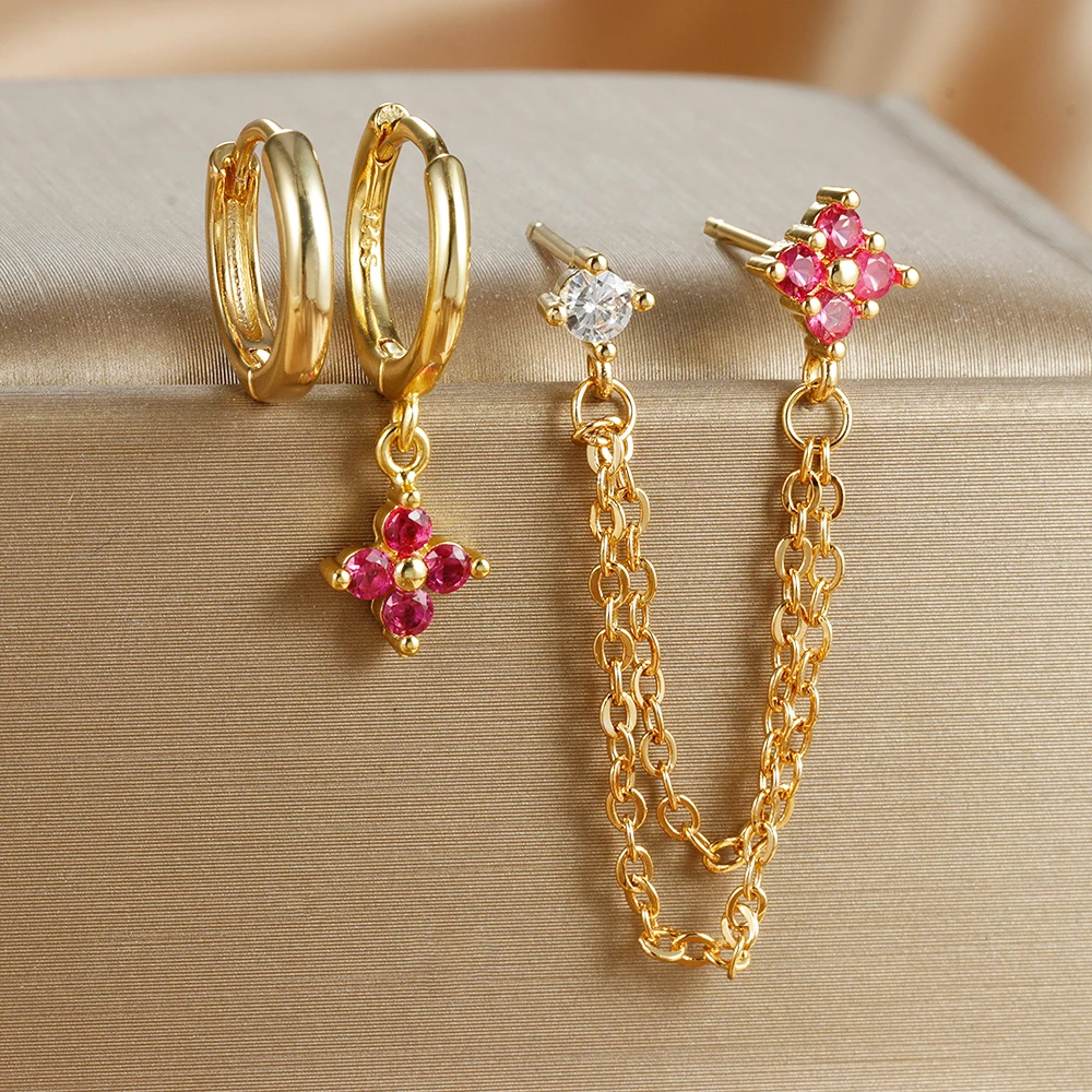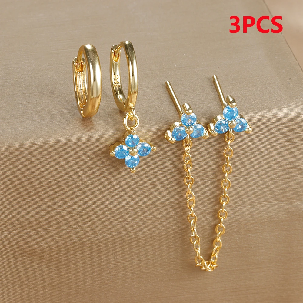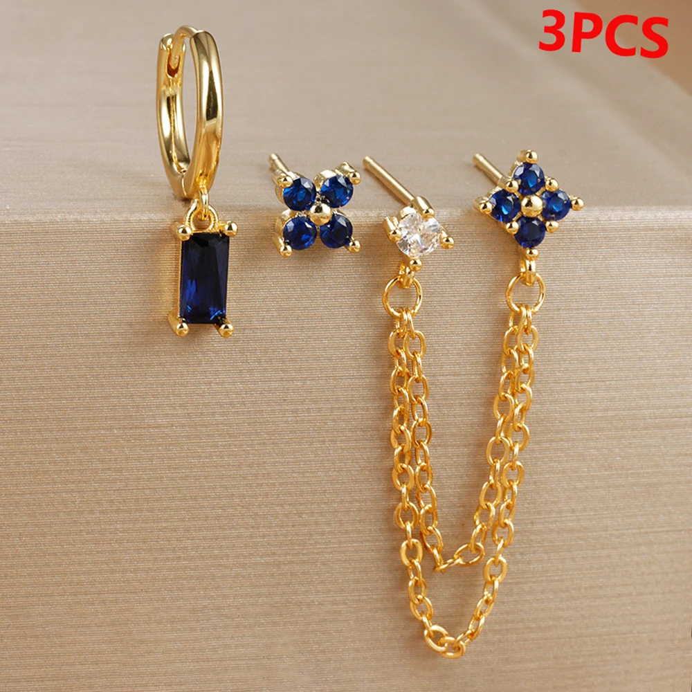 Luxury Four Zircons Flower Hoop Earrings Set For Women 18K Gold Plated Double Studs Chain Tassel Piercing Earring Trendy Jewelry