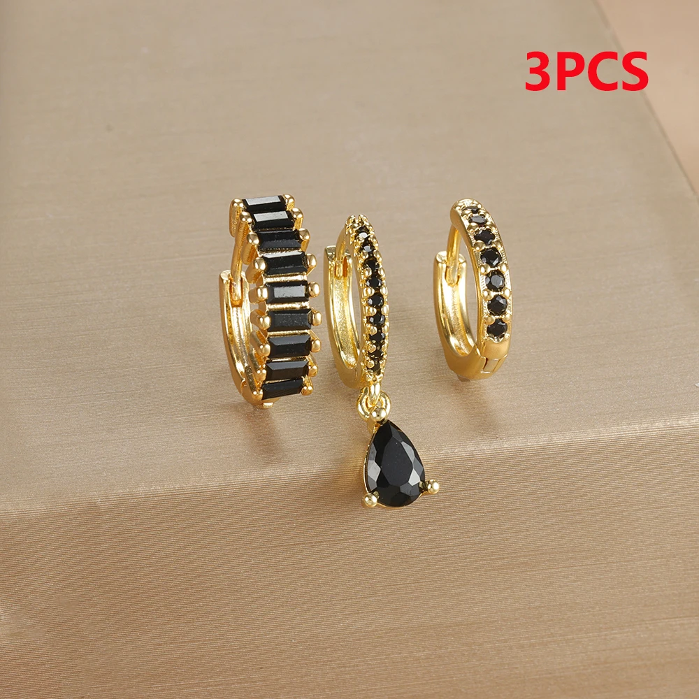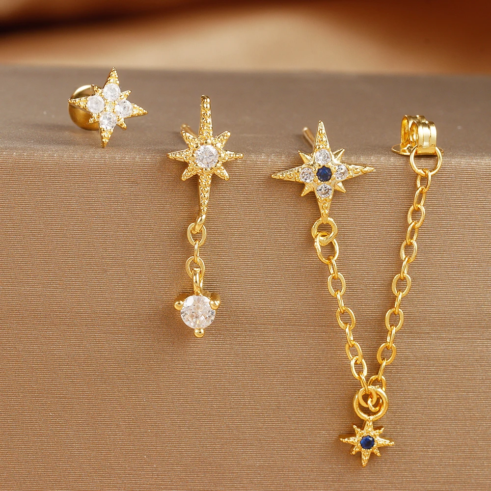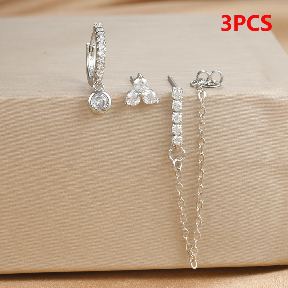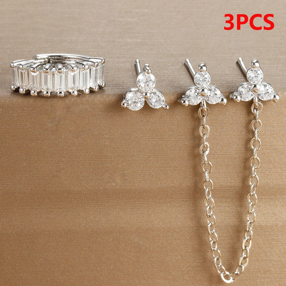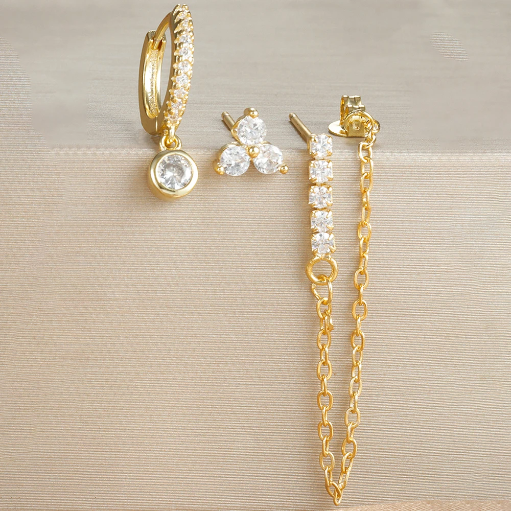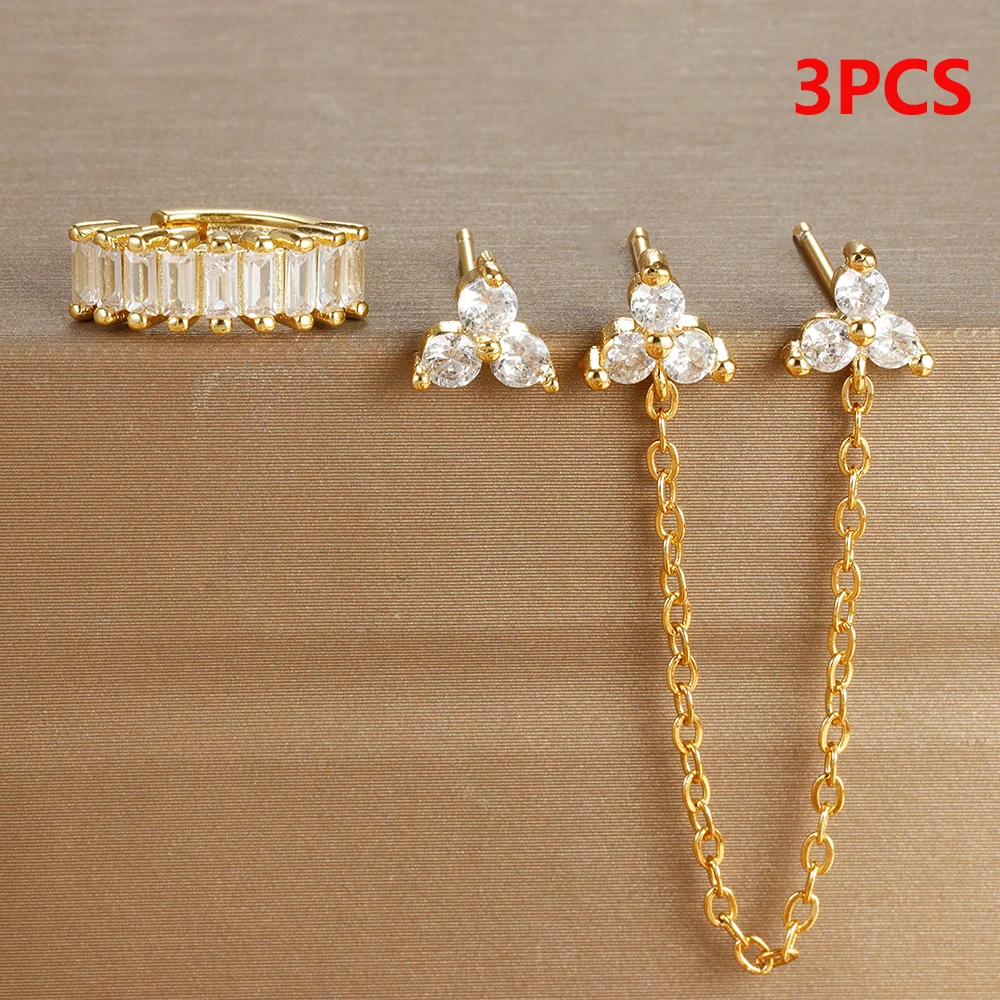 Luxury Four Zircons Flower Hoop Earrings Set For Women 18K Gold Plated Double Studs Chain Tassel Piercing Earring Trendy Jewelry