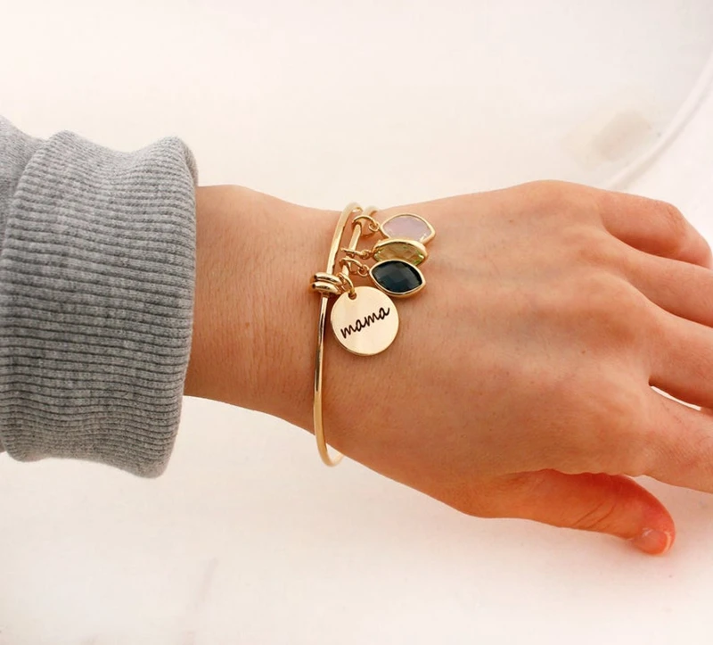 Personalized Family Names Stainless Steel Round Charms Bracelet with Birthstones Custom Engraved Names Bangle Gift for Mother