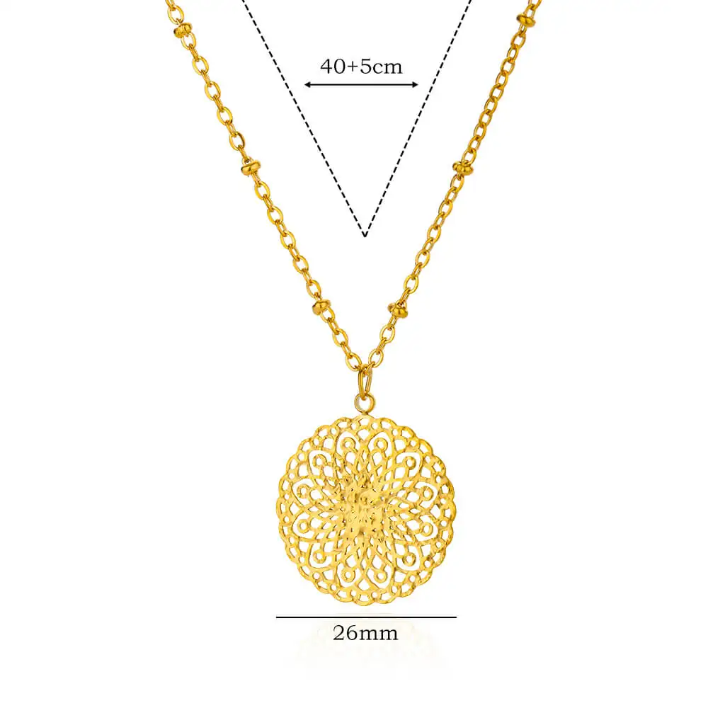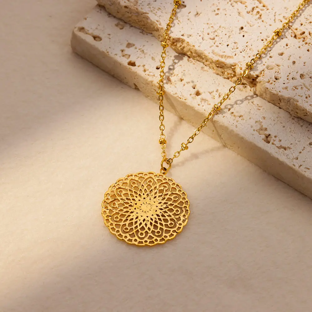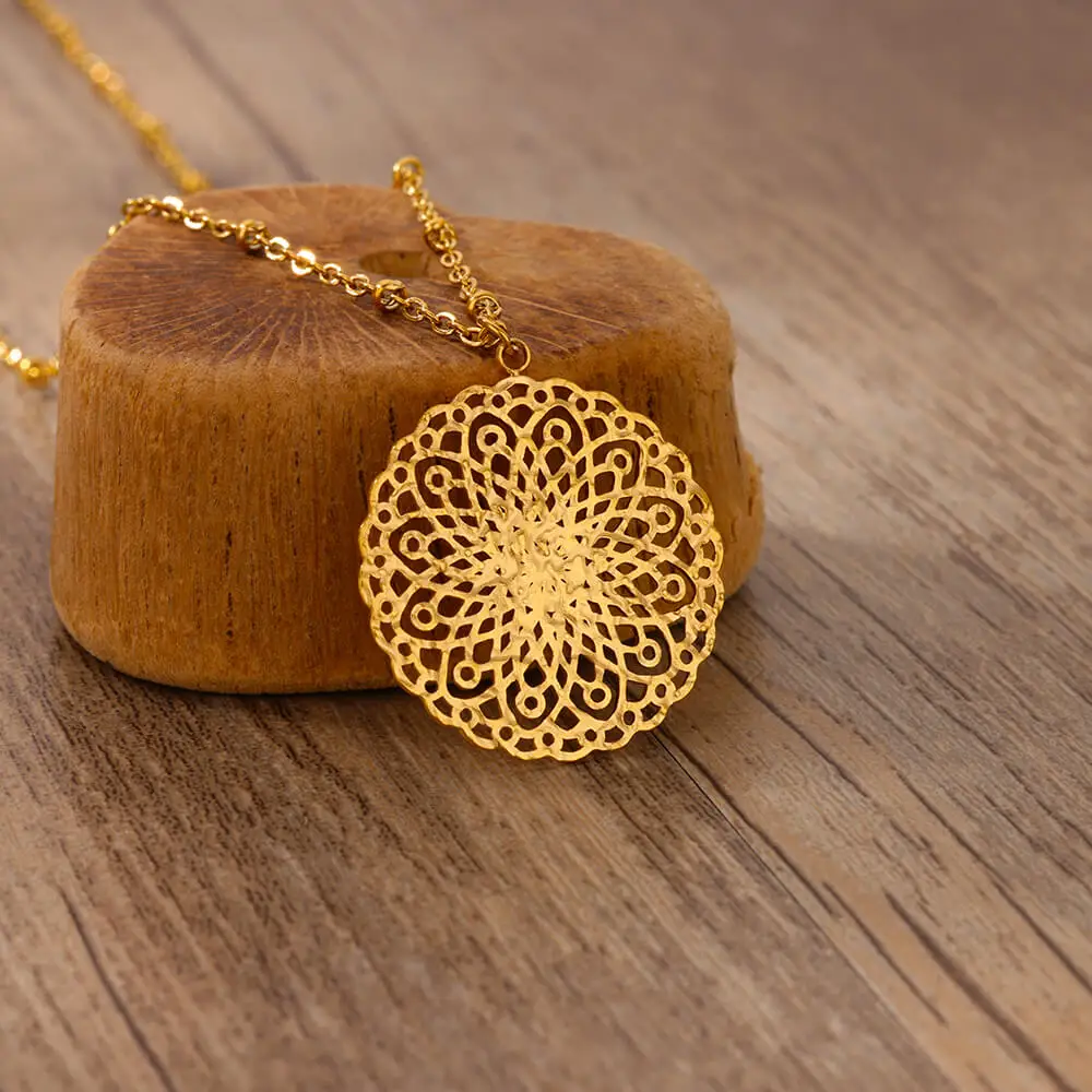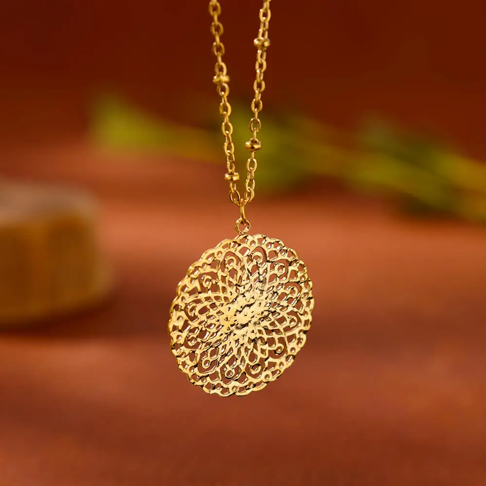 Stainless Steel Mesh Flower Round Penant Necklaces For Women Gold Color Aesthetic Flower Pendant Necklace 2024 Trendy Jewelry