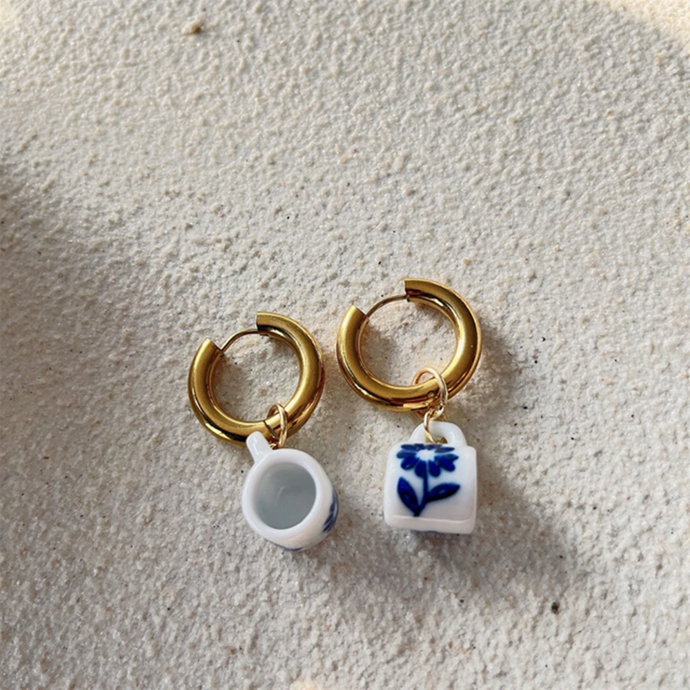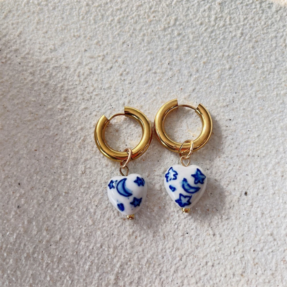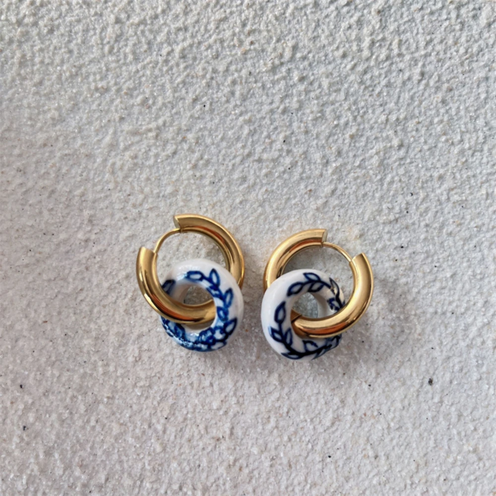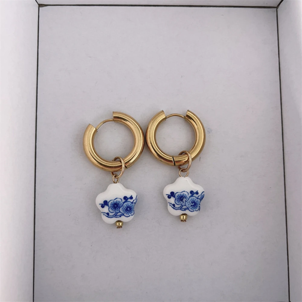 Trendy Stainless Steel Hoop Earrings Blue White Enamel Ceramics Pendant Earrings for Women Geometry Daily Jewelry Gift Wholesale