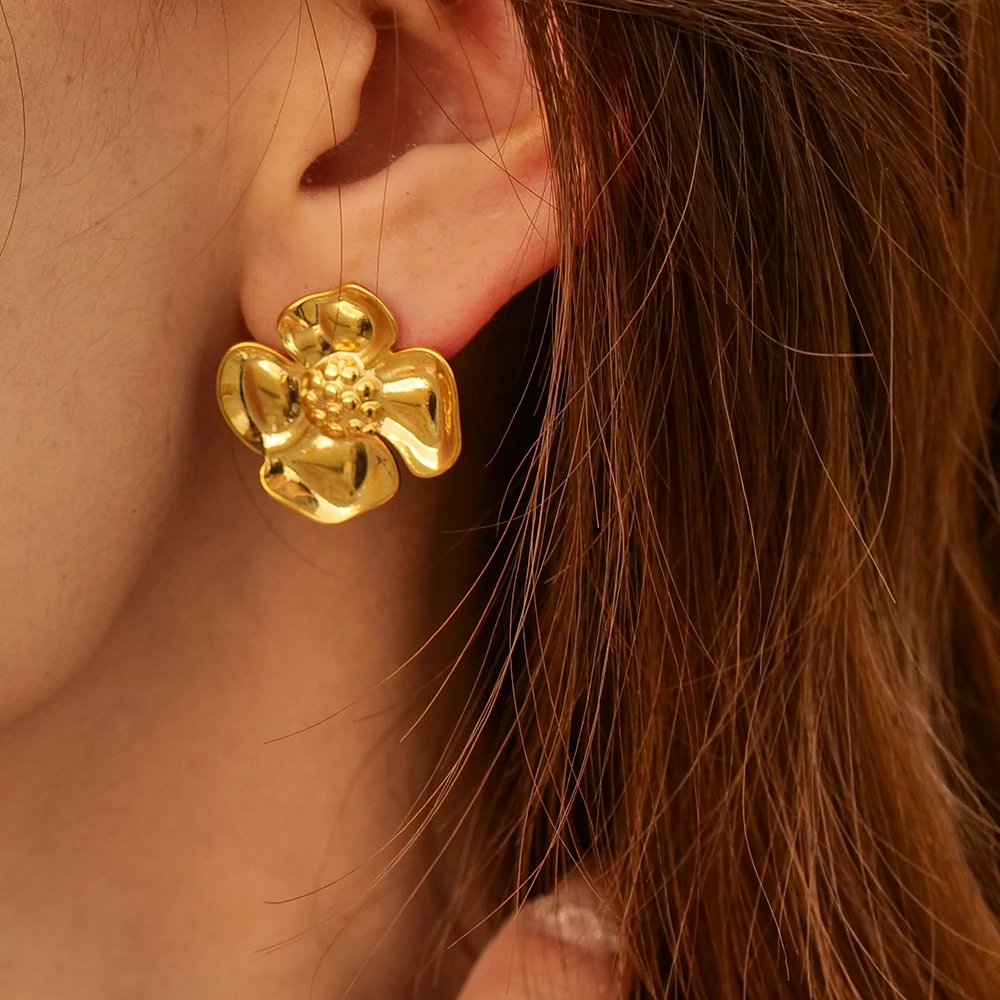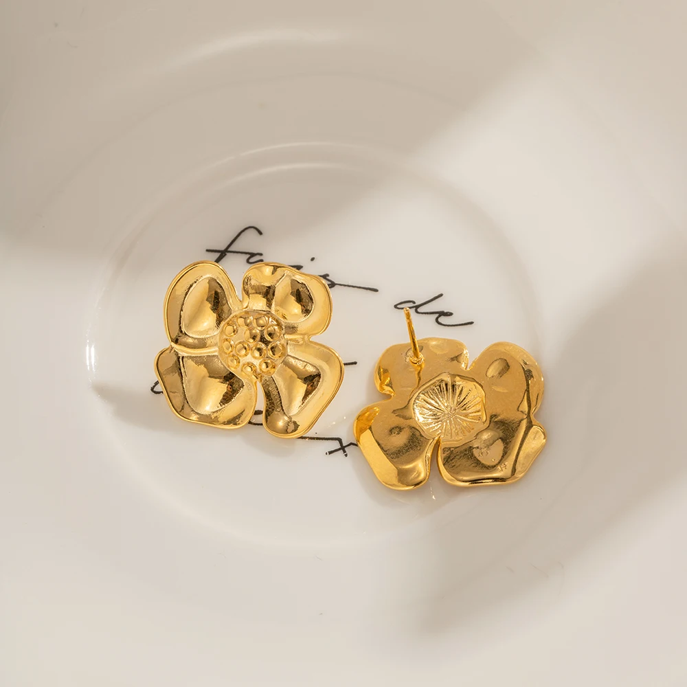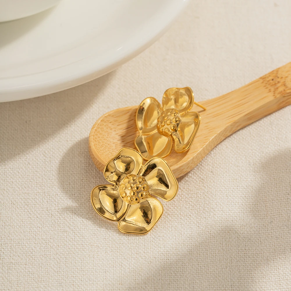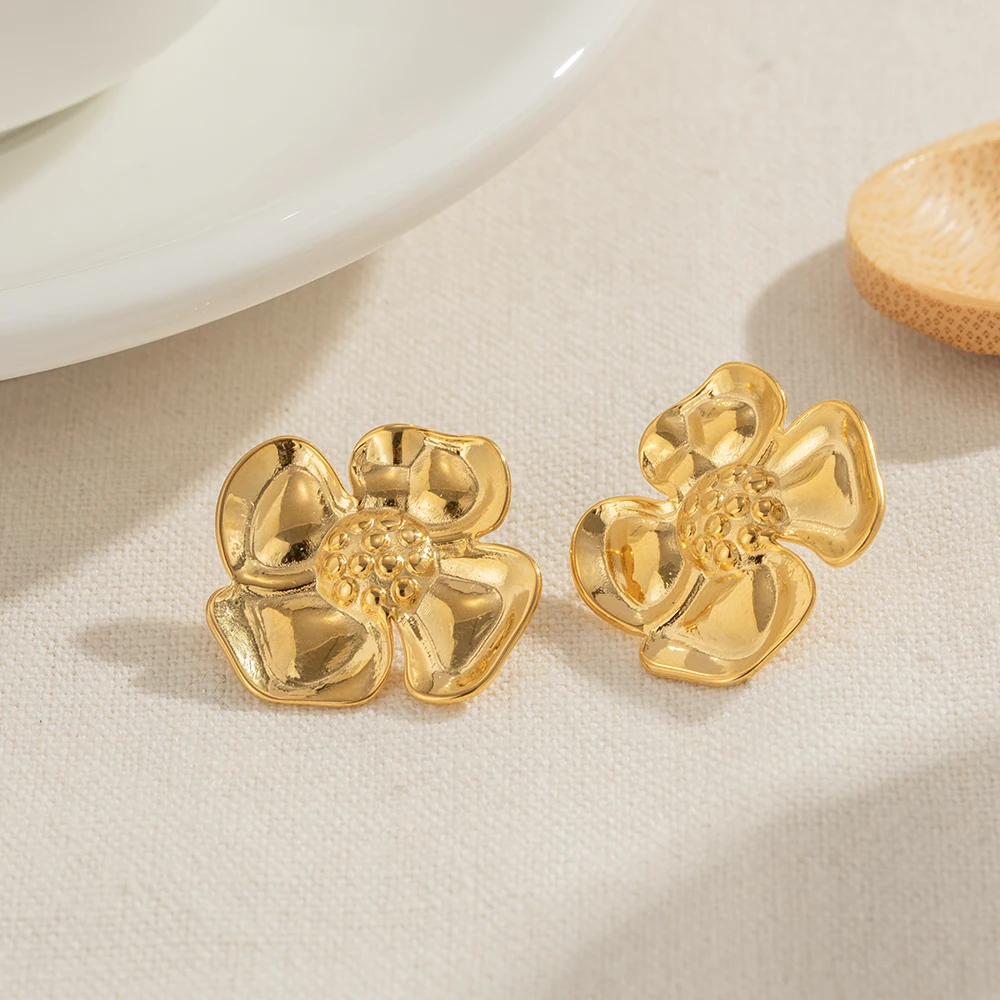 Vintage Exaggerated Stainless Steel Flower Stud Earrings Waterproof 18K Gold PVD Plated For Women Exquisite Party Jewelry