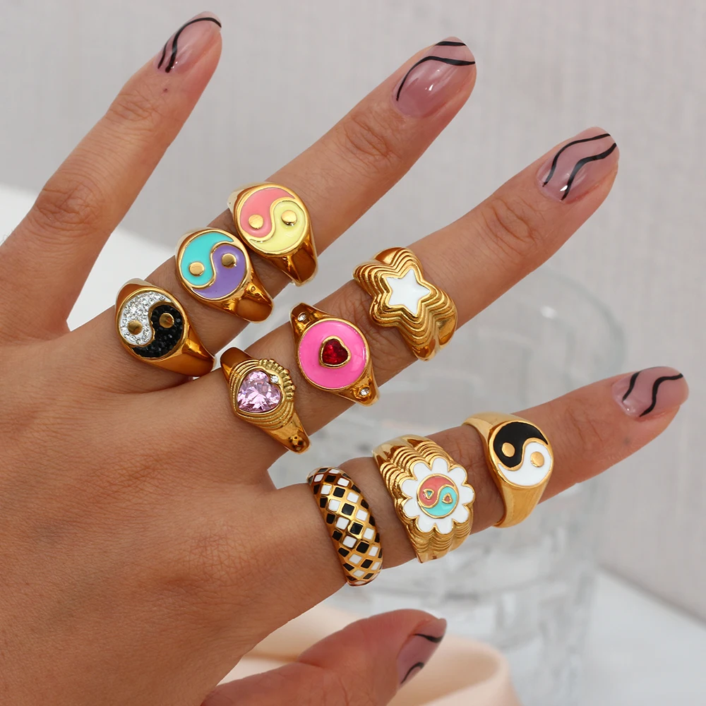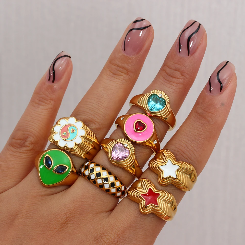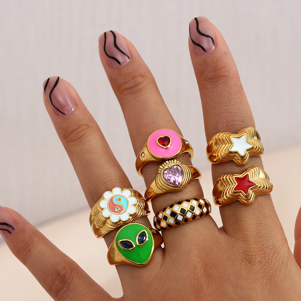 Water Resistant Stainless Steel Ring Flower Yingyang Grid Heart Star Alien Colorful Enamel Stone Rings For Womem Gold Ring