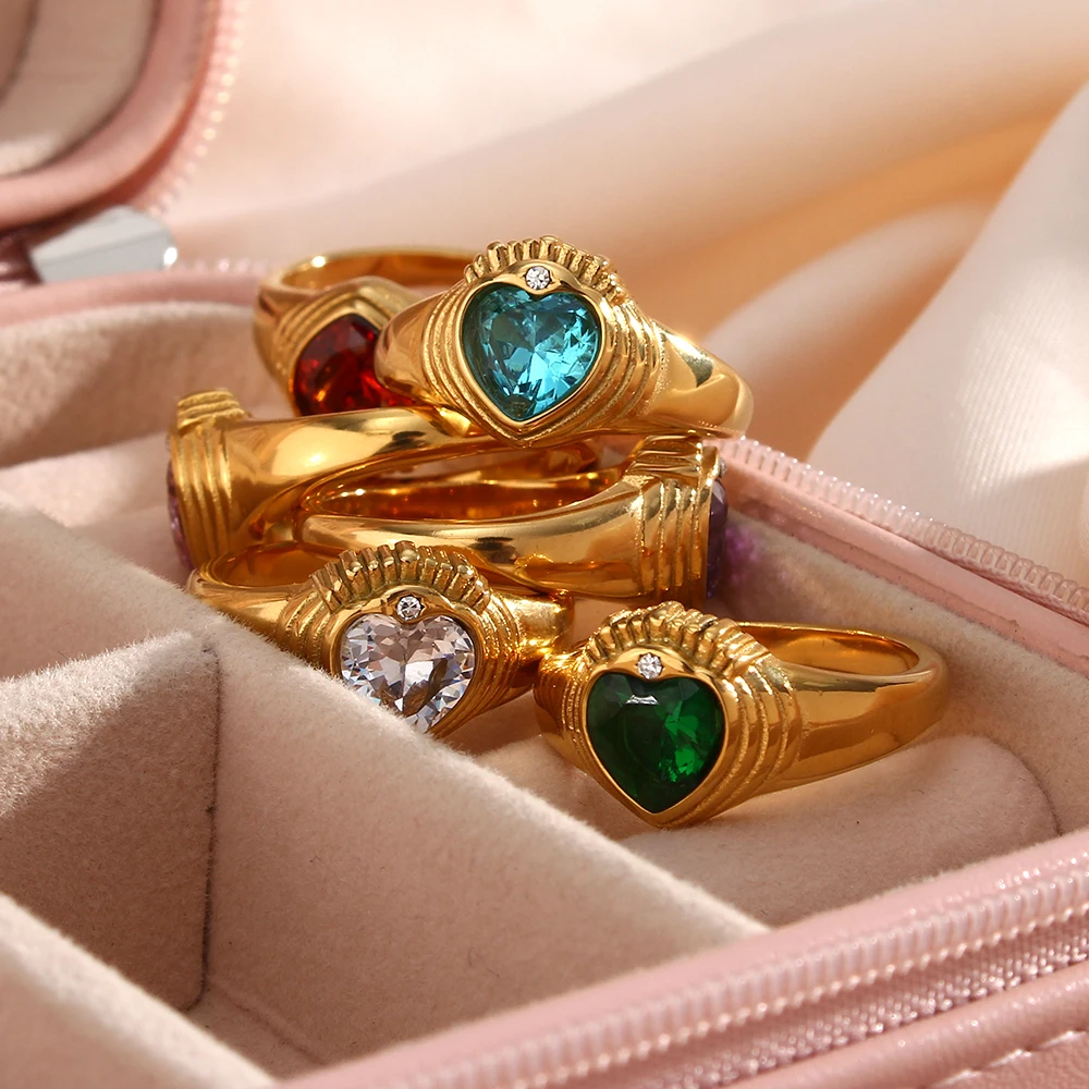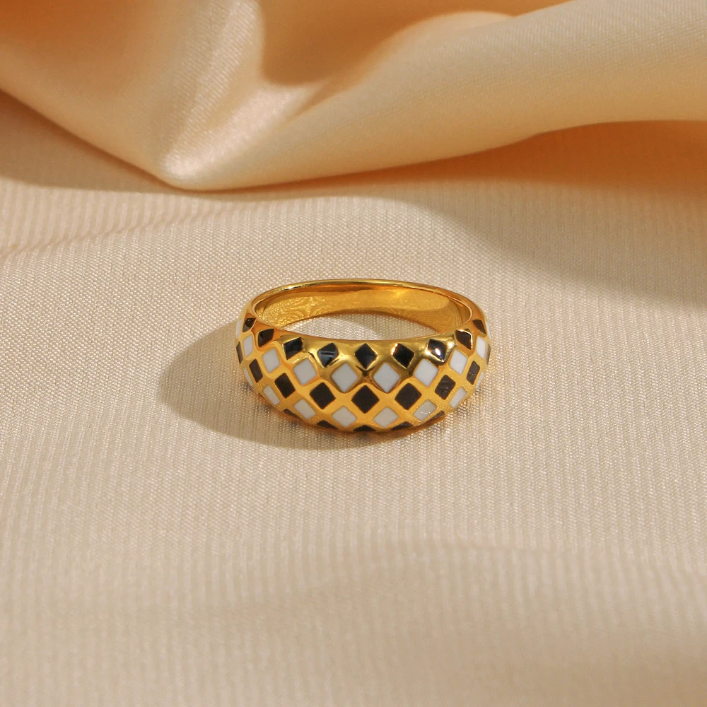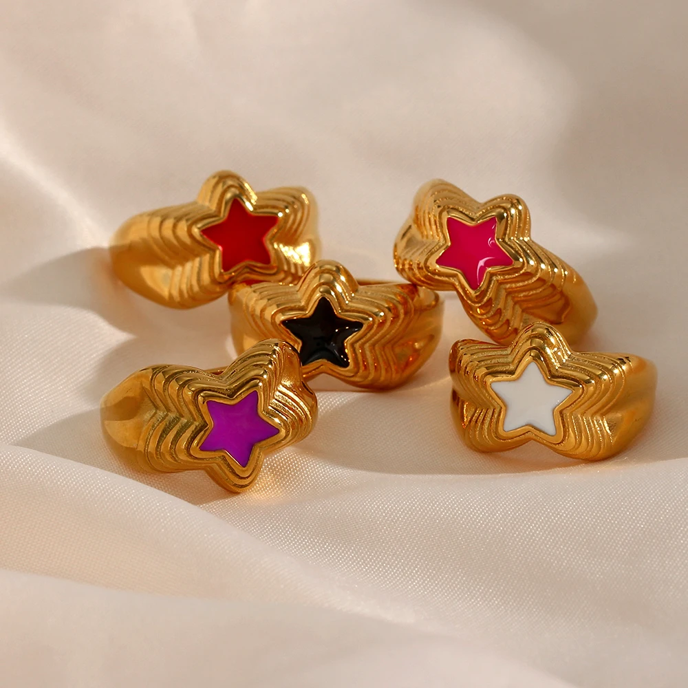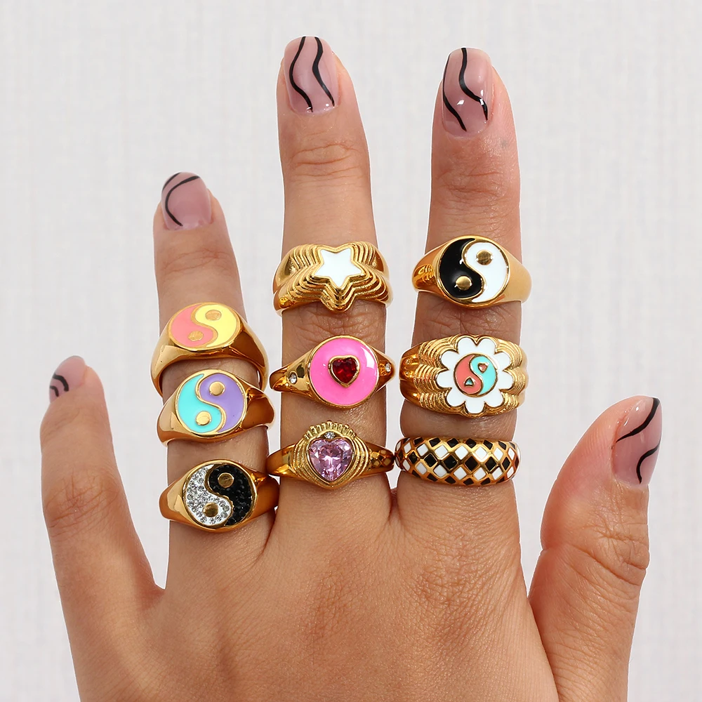 Water Resistant Stainless Steel Ring Flower Yingyang Grid Heart Star Alien Colorful Enamel Stone Rings For Womem Gold Ring