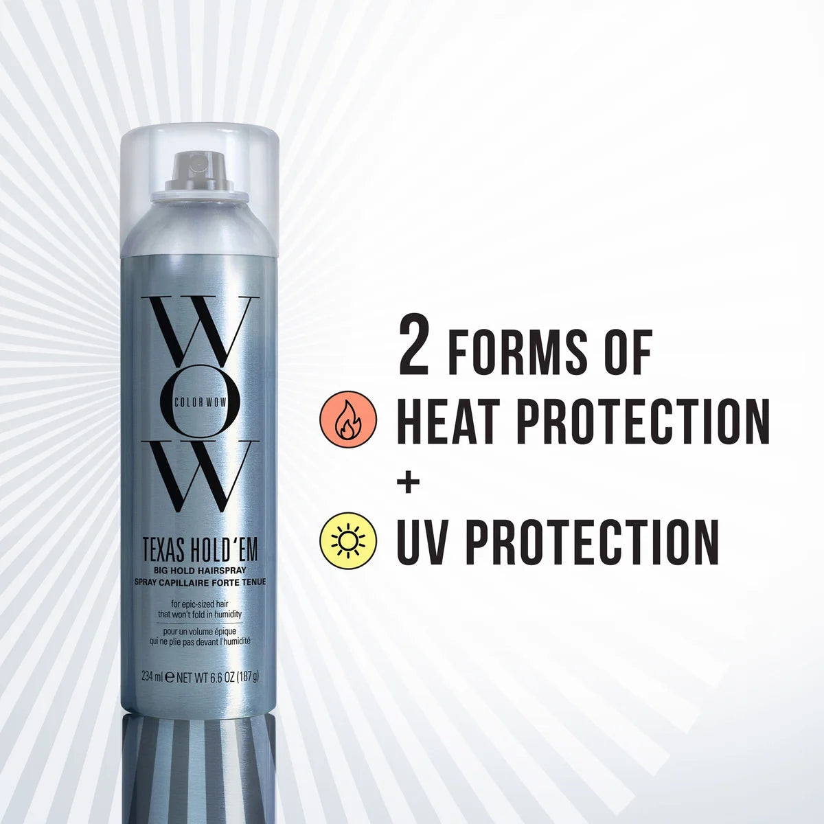 Color Wow Texas Hold’em Big Hold Hairspray – 234ml is a powerful, salon‑grade hairspray that delivers long-lasting hold, brilliant shine, and frizz‑resistant performance — ideal for both everyday styling and special occasions. Designed for those who want their look to stay intact from morning till night, this hairspray locks in styles with strength and control but still feels light and touchable.