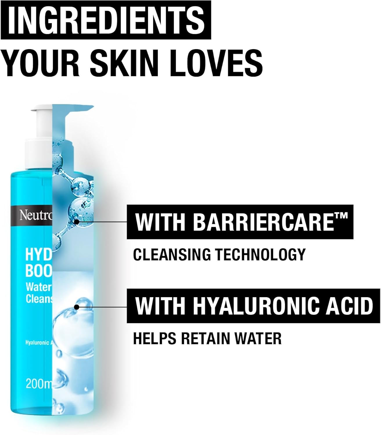 The Neutrogena Hydro Boost Water Gel Facial Cleanser (200ml) is a refreshing, lightweight cleanser specially formulated to gently remove dirt, oil, and makeup while maintaining your skin’s natural moisture balance. Powered by hyaluronic acid, this innovative water gel formula helps lock in hydration and protect the skin barrier, making it ideal for dry or dehydrated skin.