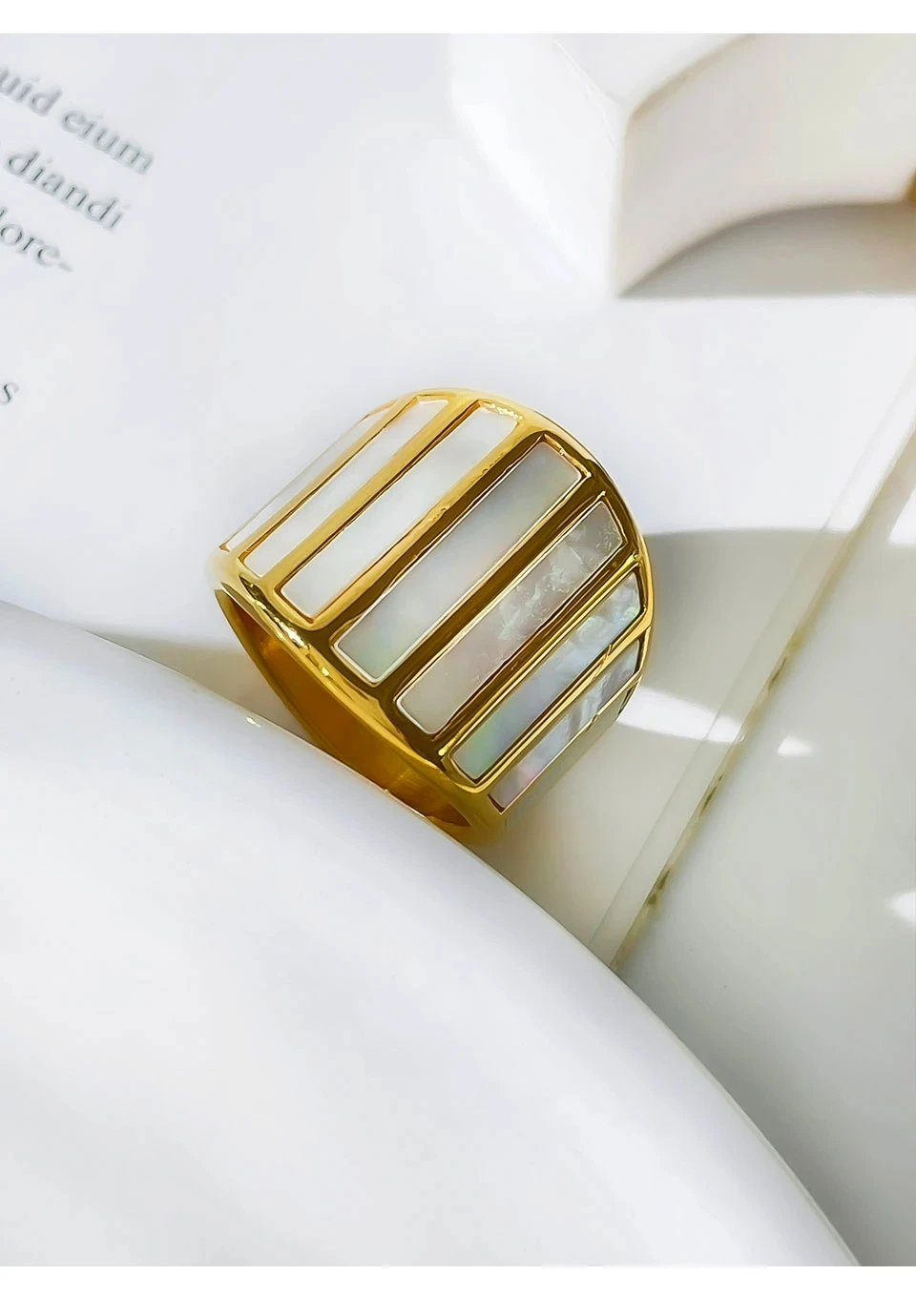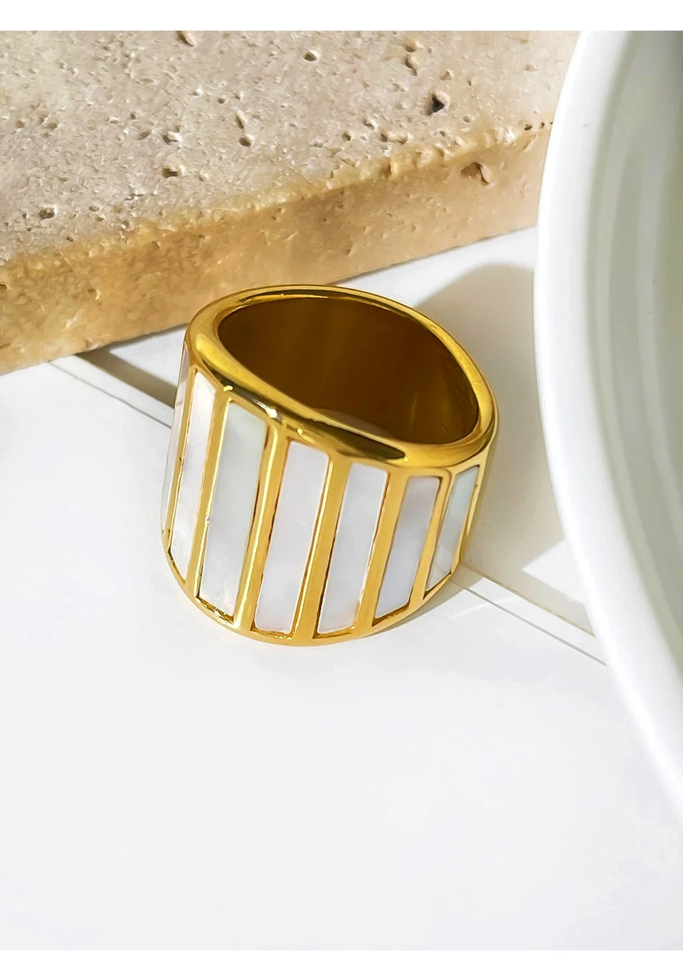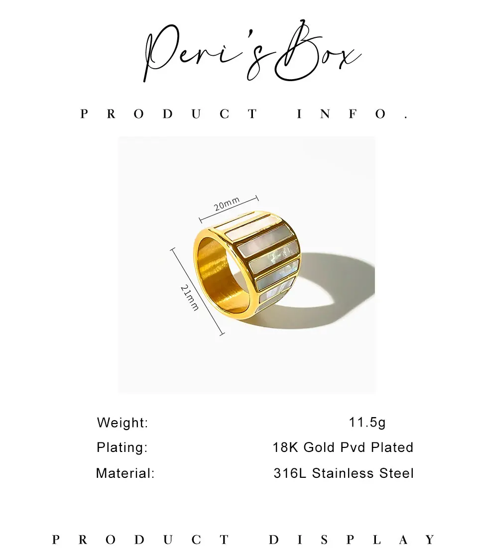 Peri'sbox Water Resistant Stainless Steel Gold Plated Chunky Natural Mother of Pearl Wide Band Ring for Women Statement Jewelry