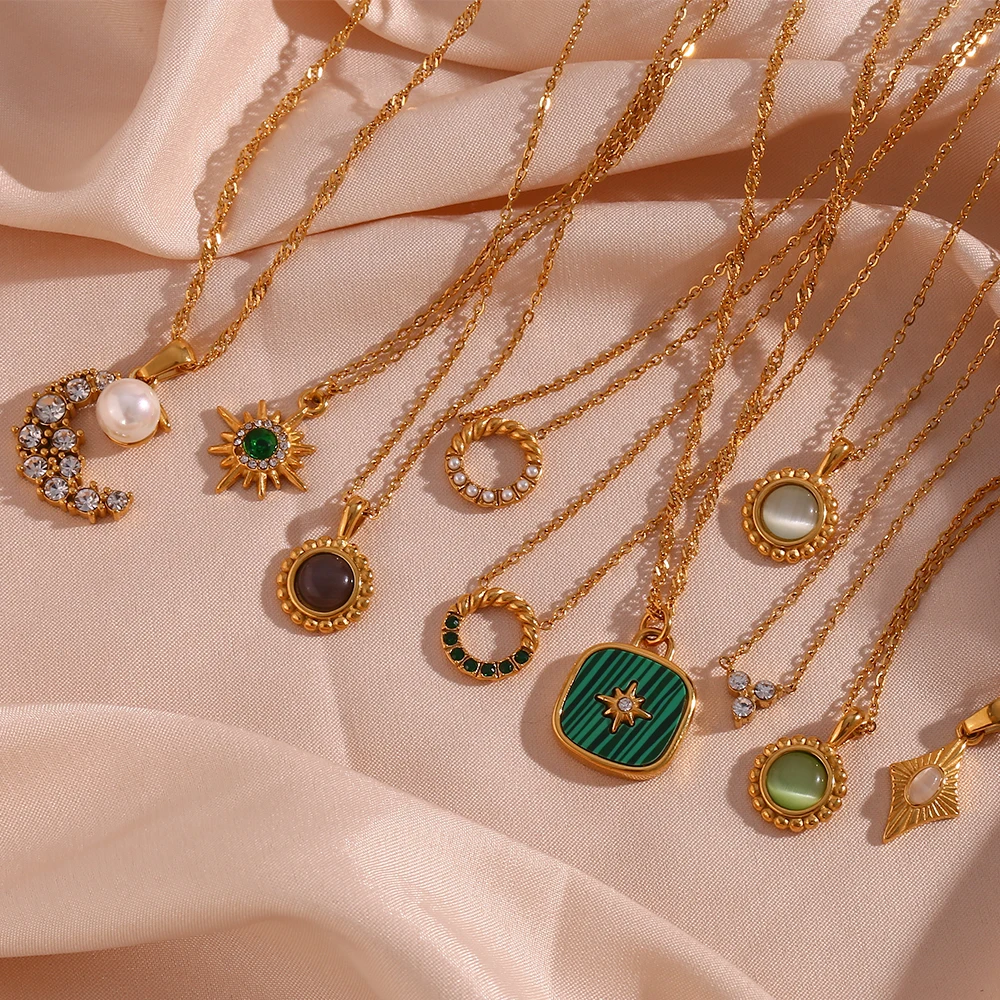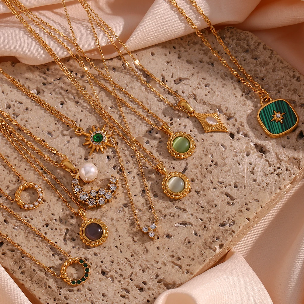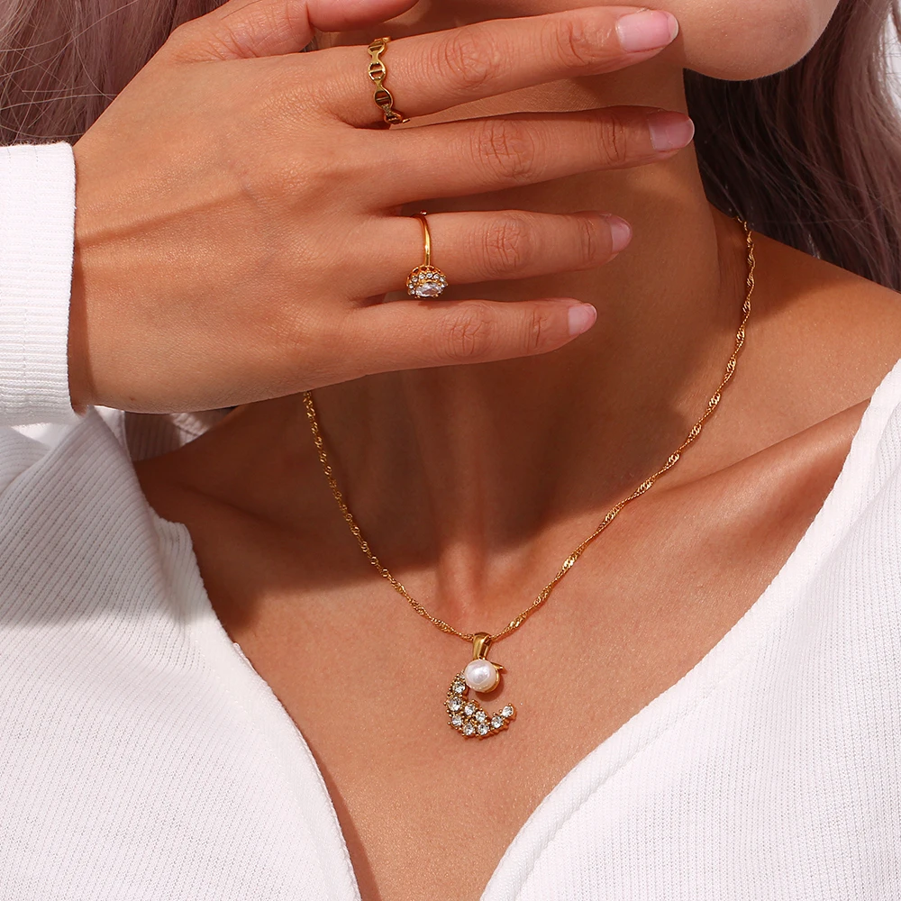 Quality Collections Waterproof Tarnish Free Stainless Steel 18K Gold Plated Shell Pearl Crystal Moon Pendant Necklaces For Women