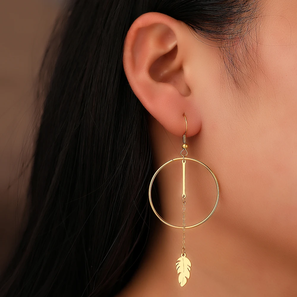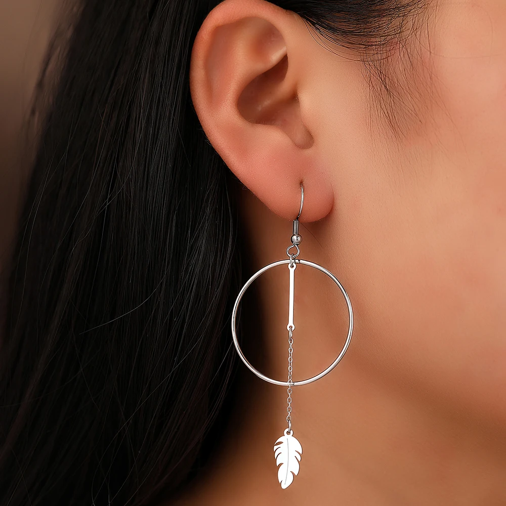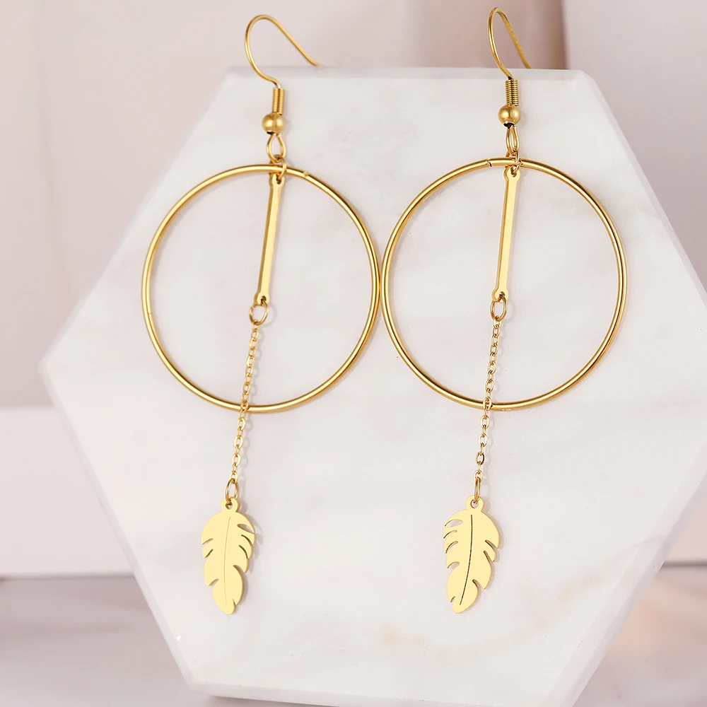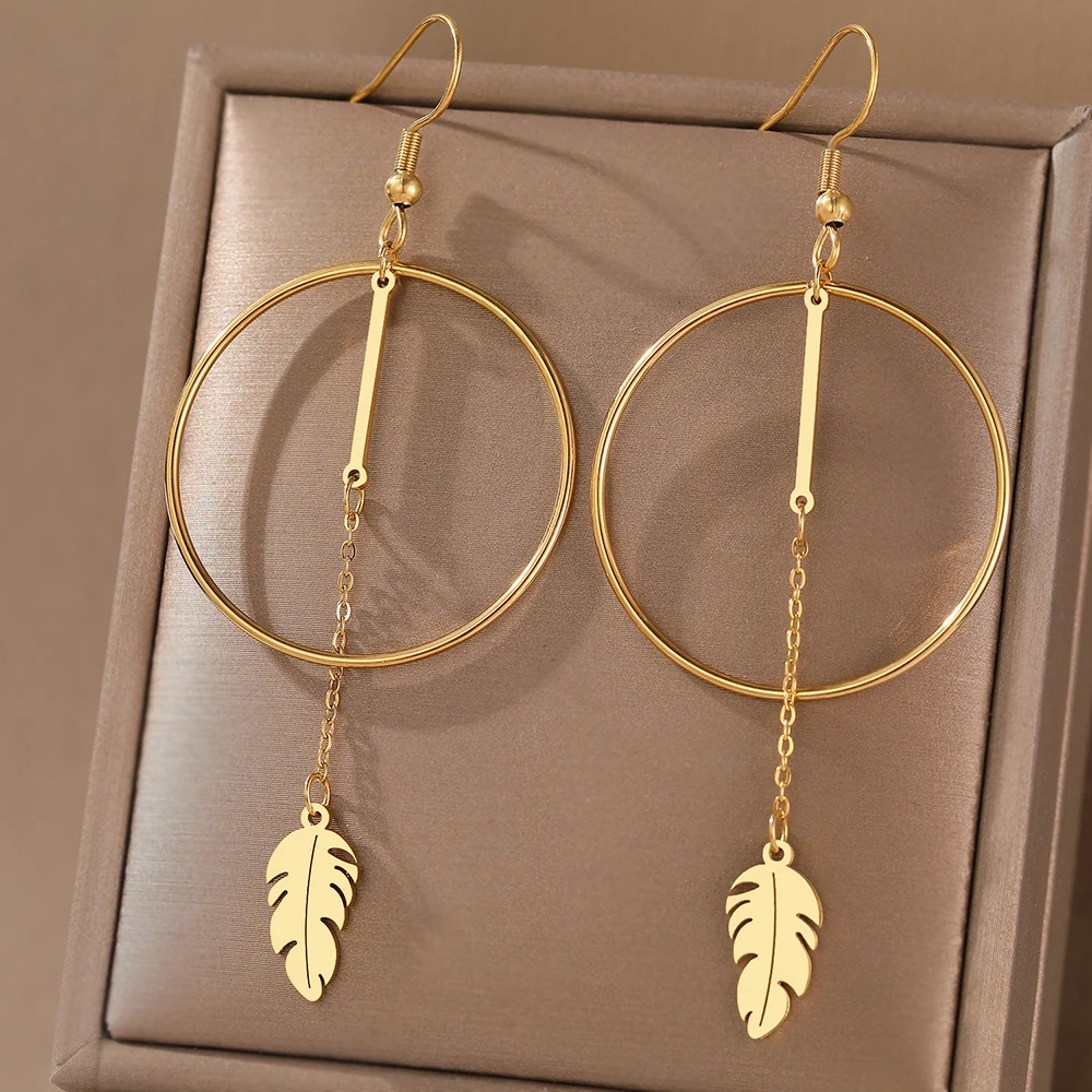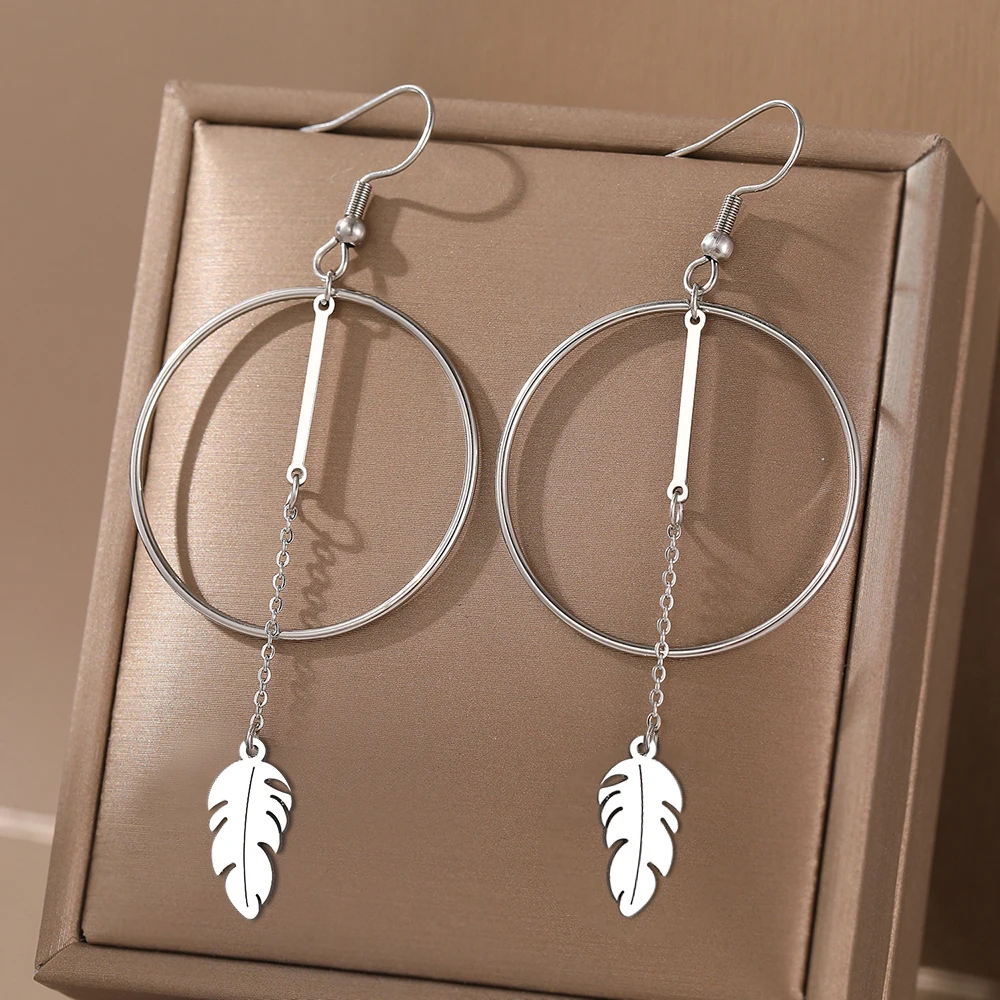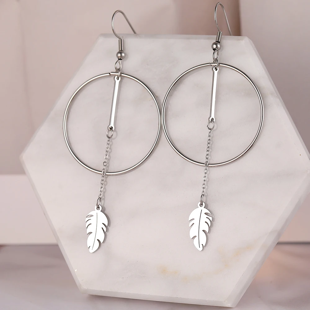 Stainless Steel Earrings Classic Feather Exaggerated Geometric Big Circle Stick Tassel Pendants Earrings For Women Jewelry Gifts