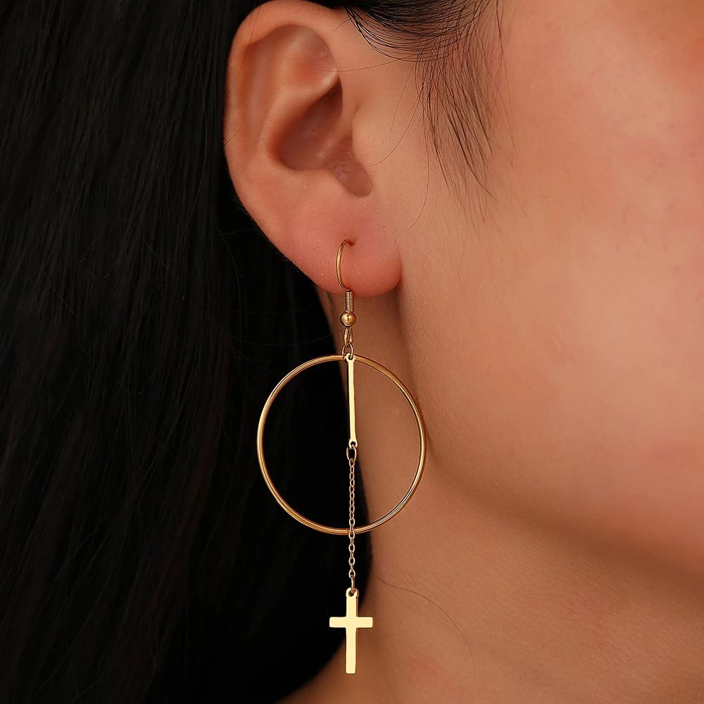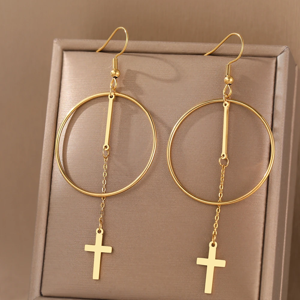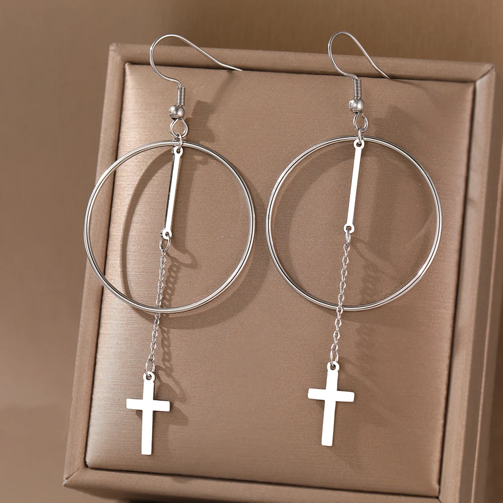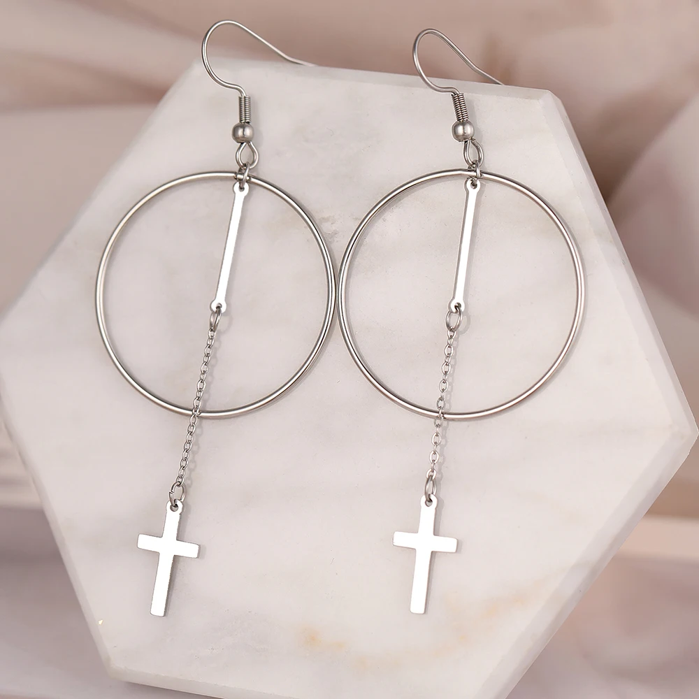 Stainless Steel Earrings Exaggerated Geometric Big Circle Stick Gothic Cross Tassel Pendants Earrings For Women Jewelry Gifts